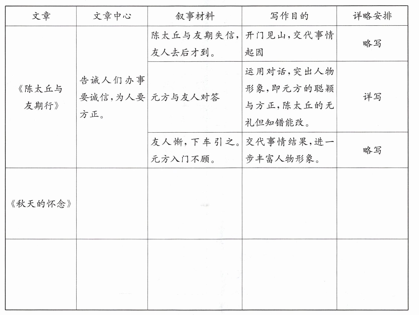 |《秋天的怀念》|歌颂母爱的深沉伟大,表达对母亲的深切怀念及生命感悟|“我”双腿瘫痪后脾气暴躁,母亲欲带“我”看菊花遭拒|交代故事背景,引出母亲的关爱|略写|
