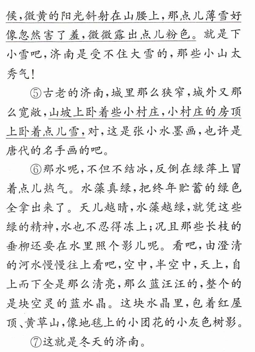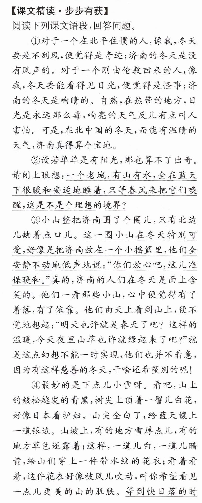 ③等到快日落的时候,微黄的阳光斜射在山腰上,那点儿薄雪好像忽然害了羞,微微露出点儿粉色。答:写雪后夕晖,非常美。最生动的是把“薄雪”比成人,有感情,会害羞,比单纯的客观写景要好。