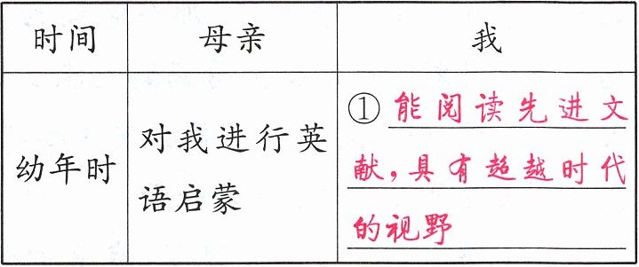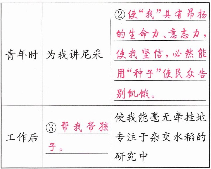 能阅读先进文献,具有超越时代的视野; 使“我”具有昂扬的生命力、意志力,使我坚信,必然能用“种子”使民众告别饥饿。; 帮我带孩子。; 别人眼中的“种子”是袁隆平研制的“杂交水稻的种子”;在袁隆平的眼中的“这粒种子”是小时候母亲对作者的启蒙和教育。; 运用了动作描写,“贴”、“指”、“找”三个动词生动形象地刻画出妈妈在地图上寻找安江时的样态,费时又费力,说明安江荒僻偏远,表现了妈妈对我的关爱和担忧。; 相同点:都表达了对逝者的敬意;不同点:本文还表达了对母亲的感激;愧疚、悔恨、遗憾之情;对母亲的思念和追忆;对母亲的告慰之情;《纪念白求恩》还寄托了作者的期望,呼吁全党学习白求恩精神。