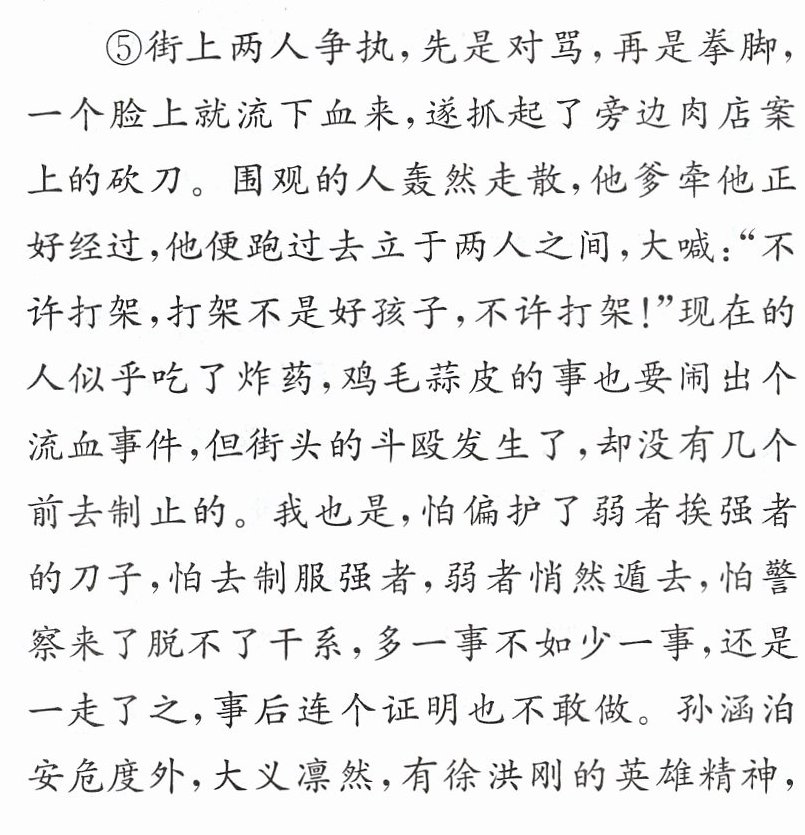 ①善良,有爱心,有慈悲胸怀,尊重生命:平时不准父母杀鸡剖鱼,不接受阿姨摘的花朵。②坚持自我,无所畏惧;大胆指挥国歌。③坦诚,直率:他对“我”写的条幅评价。④勇敢,正直,大义凛然:他制止街上两人打架。