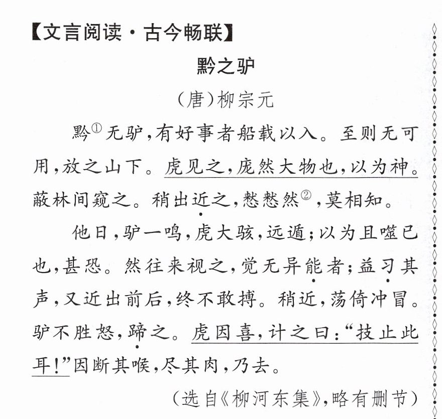@@老虎看到它,(它)是个庞然大物啊,把(它)当作神物。; 老虎于是感到高兴,盘算这事说:“(驴的)本领(或:技艺)只不过这样罢了!”