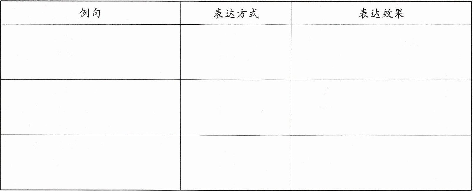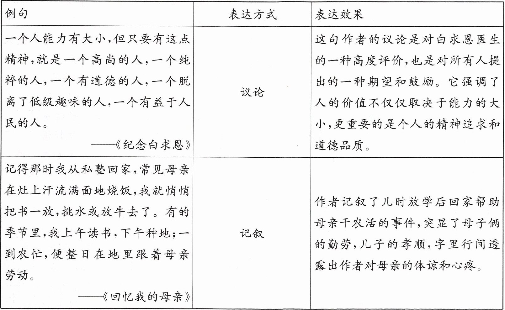 本单元课文以丰富的表达方式,从不同角度诠释了人生的意义和价值,有的抒情,有的议论,有的记叙,让我们深入感受到了理想的光辉和人格的力量。请你仿照下面示例来梳理本单元课文中运用了不同表达方式的语句,并简要赏析其表达效果。
