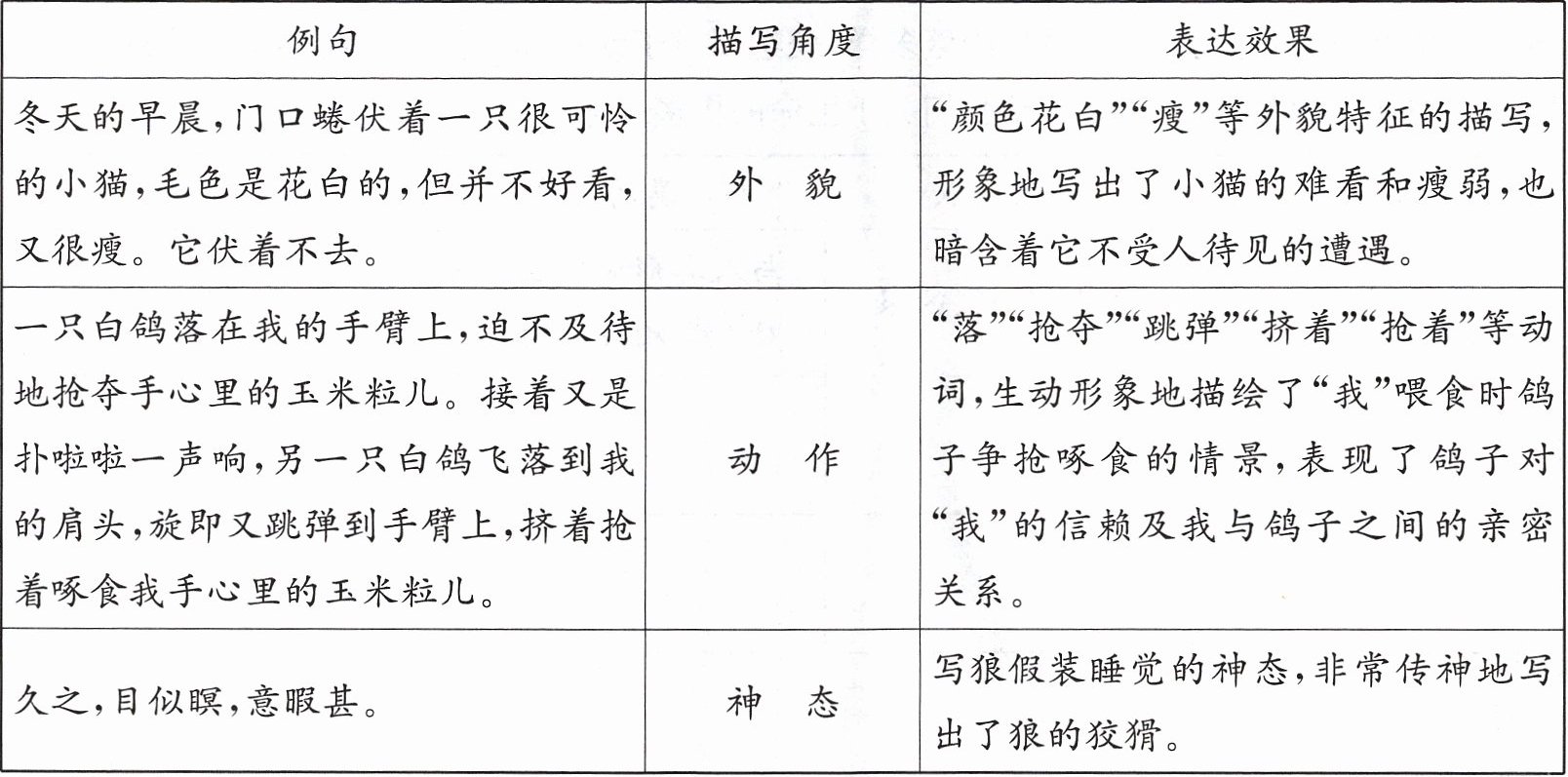 在本单元学习过程中(教材篇目、阅读篇目)中,有很多精彩围绕动物进行描写的细节。有对动物的外貌特征描写,也有对动物的动作、神态描写。精到的细节描写不仅能让文章更生动、更细腻,也能让文章的意蕴更丰富、更具体。抓住有意味的细节深入品析,就能更好地体会文章中个性化的思考和情感表达。