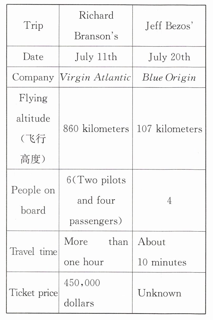 Richard Branson and Jeff Bezos,two of the world's richest men,are making this happen. Branson is a British businessman and founder(创始人)of the Virgin Group. Bezos from the US is the founder of Amazon,the world's biggest tech-company. In July,the two men flew into space. They also enjoyed beautiful views of Earth. Branson said the trip was “just magical”! Let's learn more about their trips from the chart.