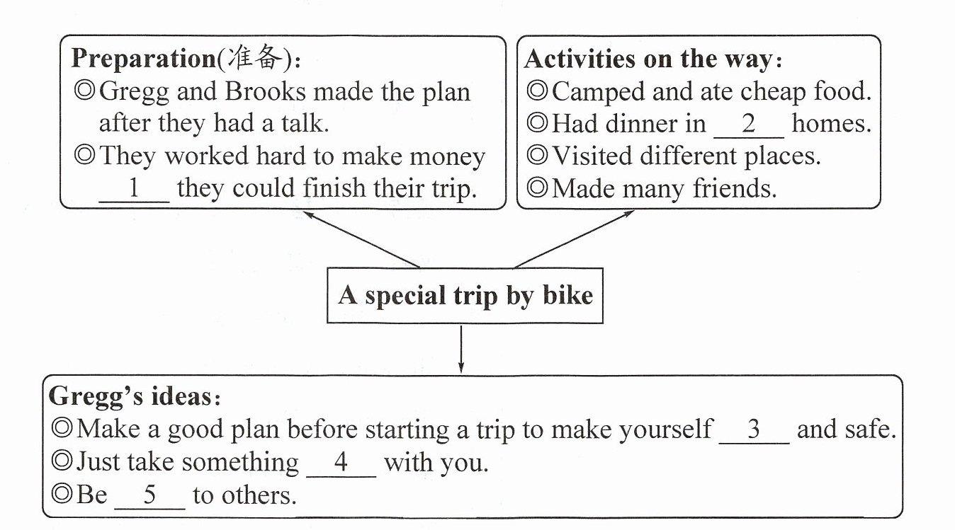 After finishing a long bike ride,Gregg Bleakney wanted to ride around America. His friend,Brooks Allen,also liked riding a bike. They talked and made a special plan—riding from the US to Argentina. Gregg and Brooks worked for a long time to make money for the trip. When they were really on the road,they often camped and ate cheap food. In many places,the local people let them have dinner in their homes. On their way,there were deserts(沙漠),rainforests and mountains. They visited big cities and small villages. And they made many friends from all over the world. Two years later,Gregg got to Argentina,but Brooks didn't finish the trip with him because of something special. The trip taught the two men a lot. Here are some of Gregg's ideas: