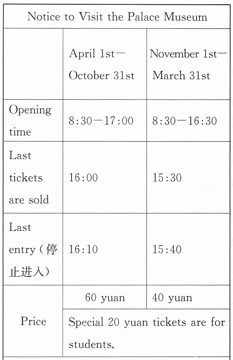 ) 2. You can't go into the Palace Museum after 16:10 in summer.(