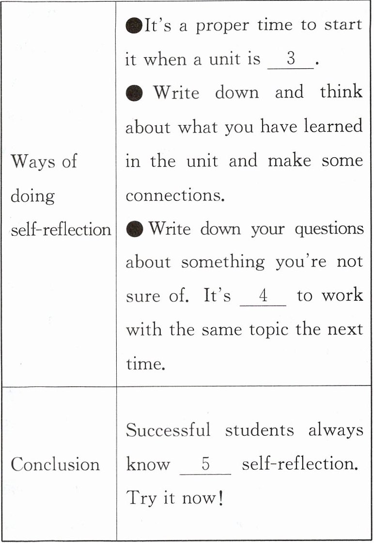 First,choose the proper time to do it. School textbooks are divided(分成)into units of study. This makes it easier to begin self-reflection. Look for time when you complete a unit of study. Sometimes you know the unit ends because there is some kind of test. Use these natural breaks to stop and do self-refection.