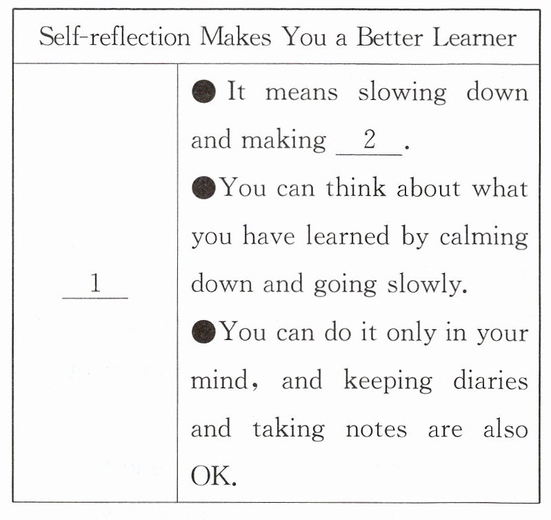 Then,find a quiet place and take out your reflection diary. Write down some notes on the new things that you learned in the unit. Let your mind think about the notes you have written and make some connections(联系).