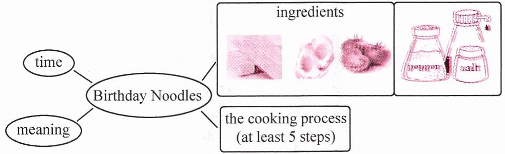 长寿面是一种中国传统美食。请你根据以下思维导图描述吃长寿面的时间、吃长寿面的意义,烹饪所需食材、调料及其数量,以及它的烹饪过程[img alt=长寿面思维导图]。