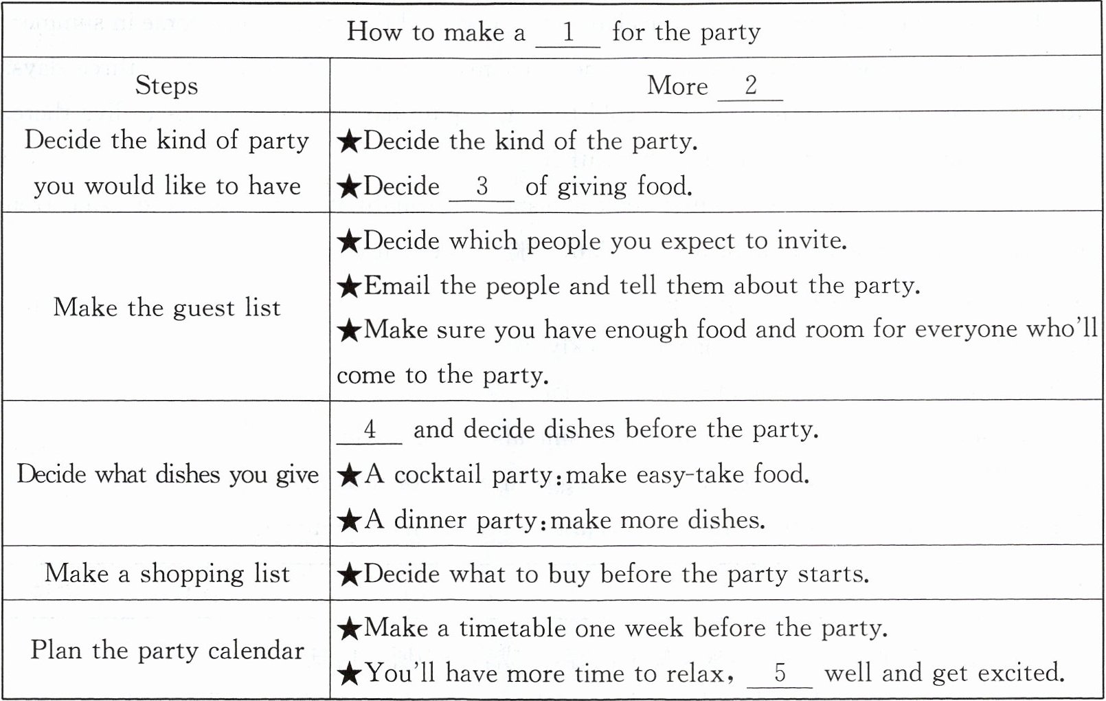 Decide the kind of party you would like to have.Do you want a cocktail party or a dinner party? Will the food be put on the table or will you have a buffet(自助餐)? The answers to these questions will help you decide the number of people to invite,and who those people should be. The answers to these questions will also help you decide the menu later. Find a notebook and write the answers to these questions in it.