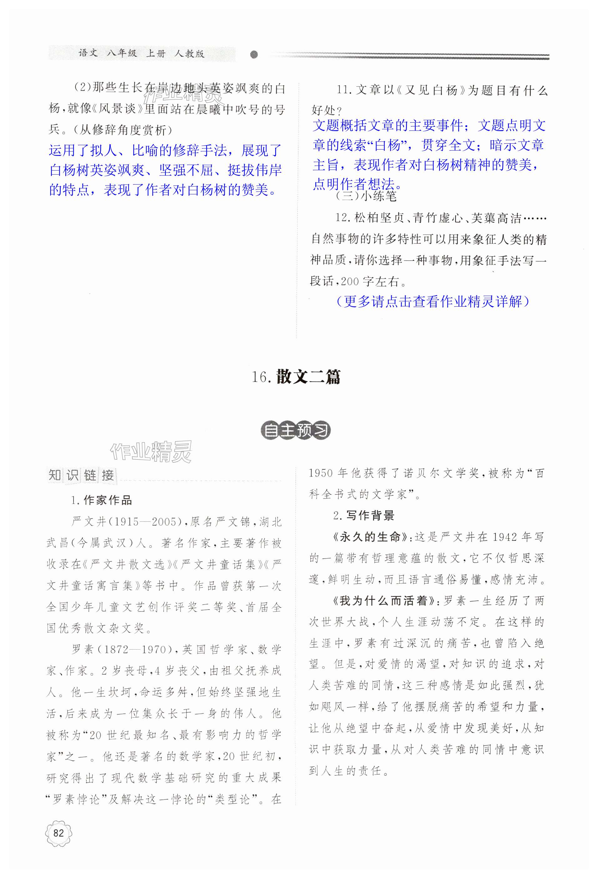 注:目前有些书本章节名称可能整理的还不是很完善,但都是按照顺序排列的,请同学们按照顺序仔细查找。练习册 2024年同步练习册明天出版社八年级语文上册人教版 答案主要是用来给同学们做完题方便对答案用的,请勿直接抄袭。