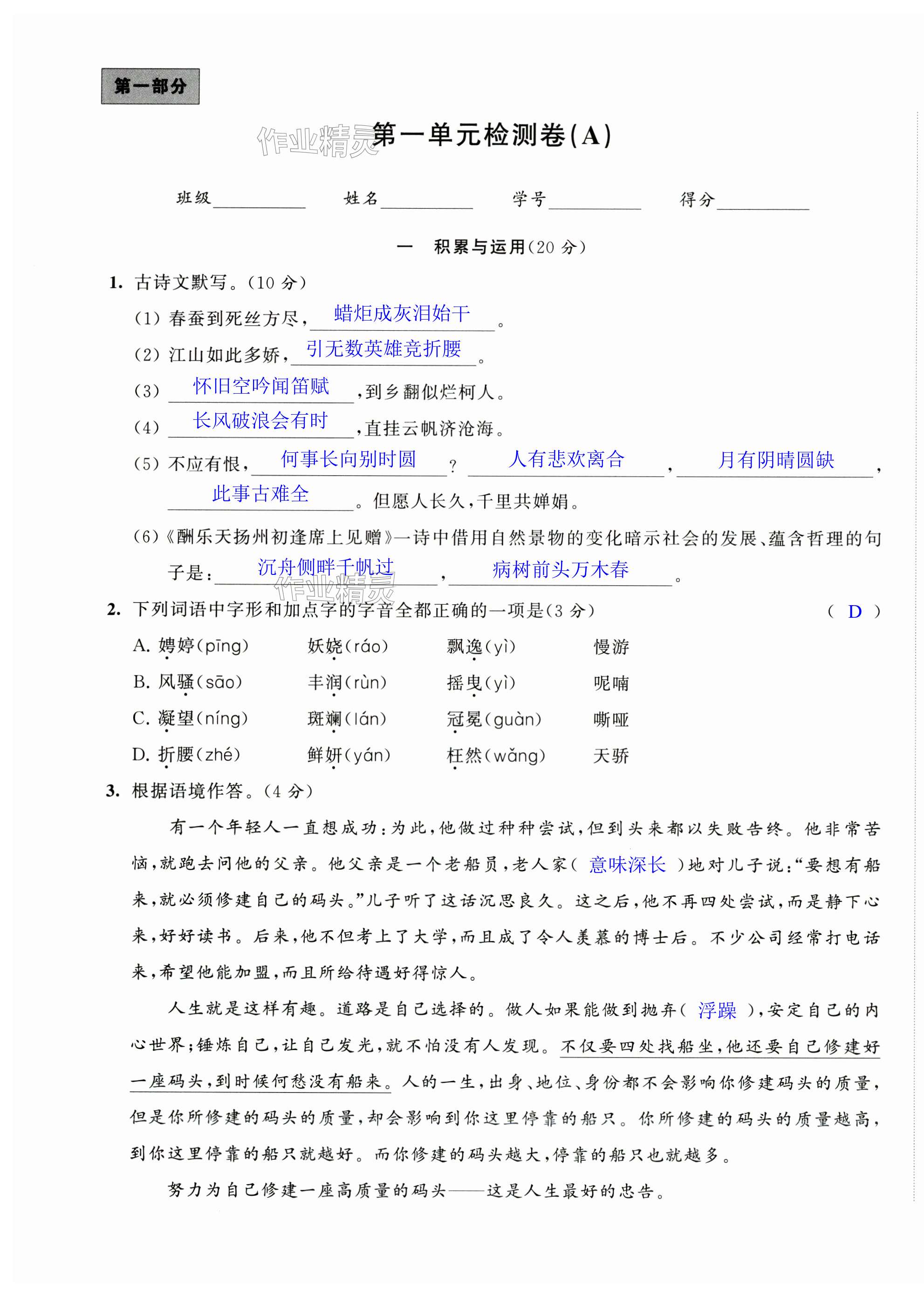 注:目前有些书本章节名称可能整理的还不是很完善,但都是按照顺序排列的,请同学们按照顺序仔细查找。练习册 2024年阳光互动绿色成长空间九年级语文上册提优版 答案主要是用来给同学们做完题方便对答案用的,请勿直接抄袭。