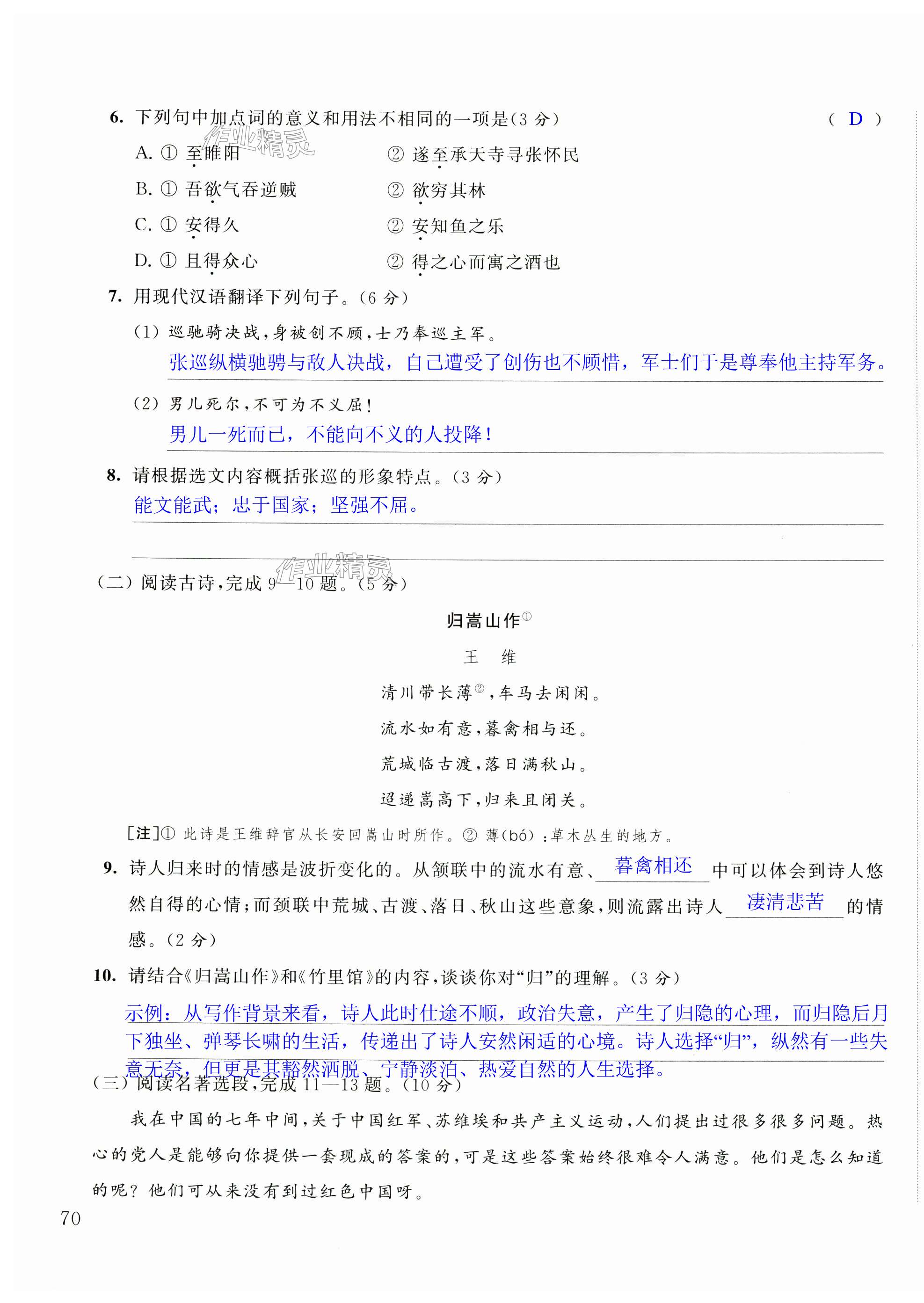 注:目前有些书本章节名称可能整理的还不是很完善,但都是按照顺序排列的,请同学们按照顺序仔细查找。练习册 2024年阳光互动绿色成长空间九年级语文上册提优版 答案主要是用来给同学们做完题方便对答案用的,请勿直接抄袭。
