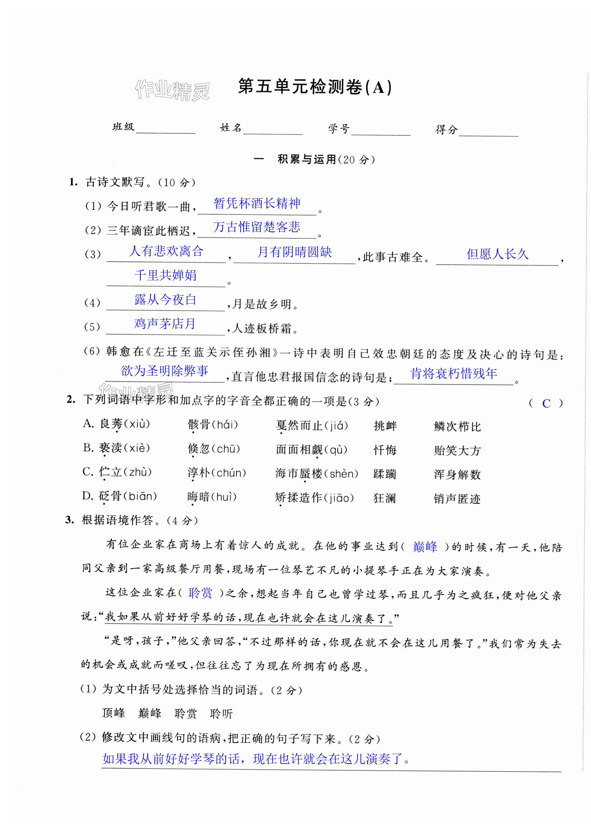 注:目前有些书本章节名称可能整理的还不是很完善,但都是按照顺序排列的,请同学们按照顺序仔细查找。练习册 2024年阳光互动绿色成长空间九年级语文上册提优版 答案主要是用来给同学们做完题方便对答案用的,请勿直接抄袭。