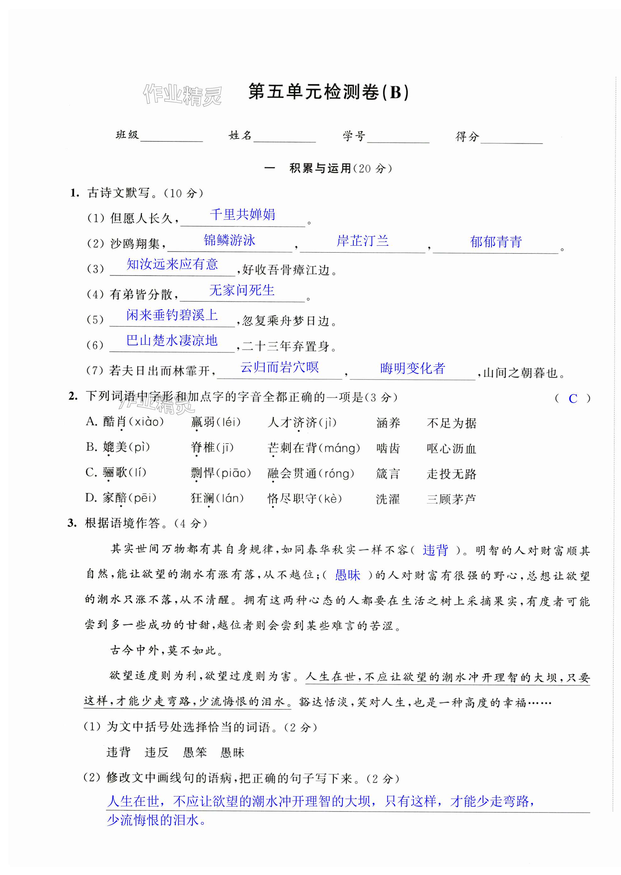 注:目前有些书本章节名称可能整理的还不是很完善,但都是按照顺序排列的,请同学们按照顺序仔细查找。练习册 2024年阳光互动绿色成长空间九年级语文上册提优版 答案主要是用来给同学们做完题方便对答案用的,请勿直接抄袭。