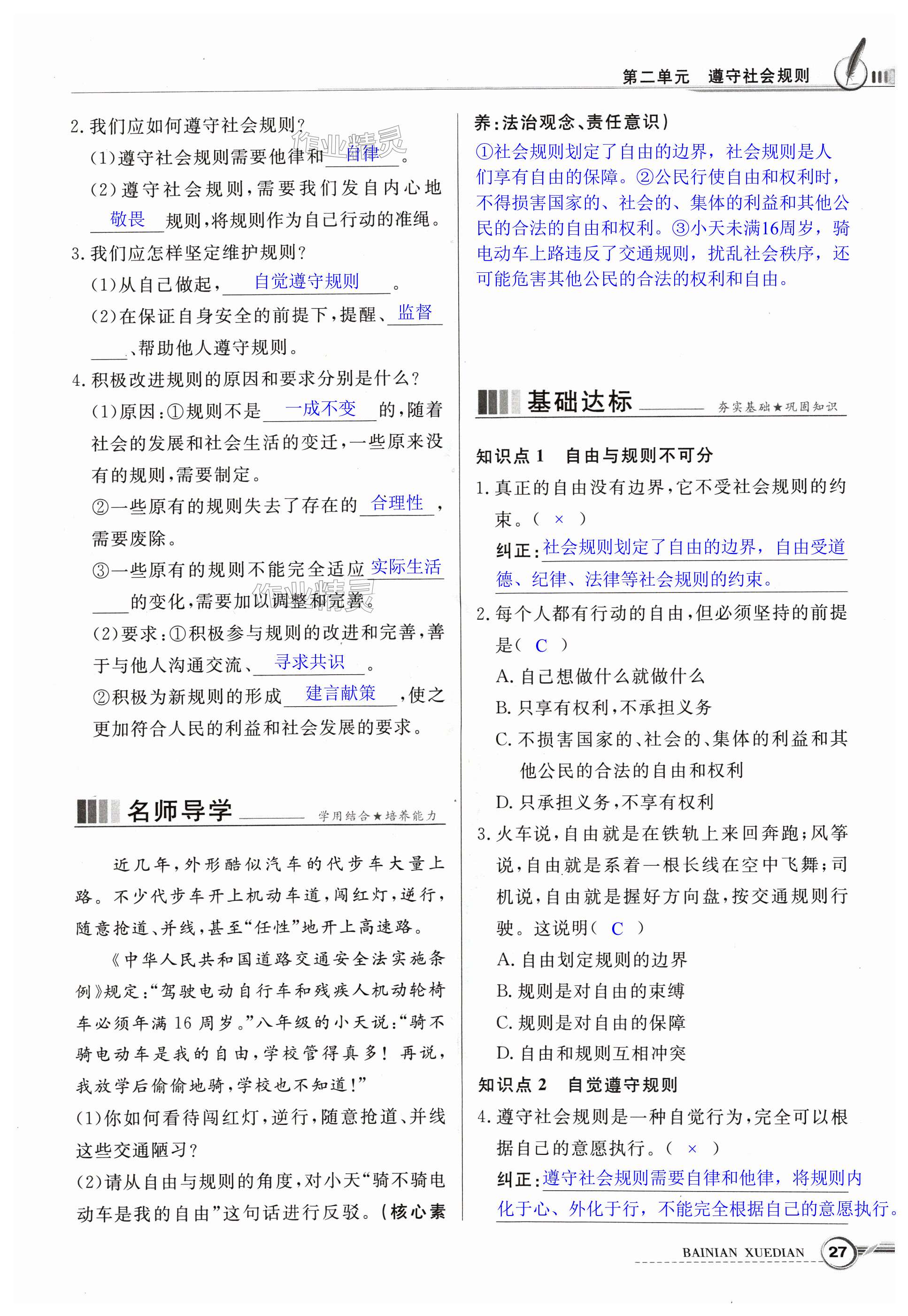 注:目前有些书本章节名称可能整理的还不是很完善,但都是按照顺序排列的,请同学们按照顺序仔细查找。练习册 2024年同步导学与优化训练八年级道德与法治上册人教版 答案主要是用来给同学们做完题方便对答案用的,请勿直接抄袭。