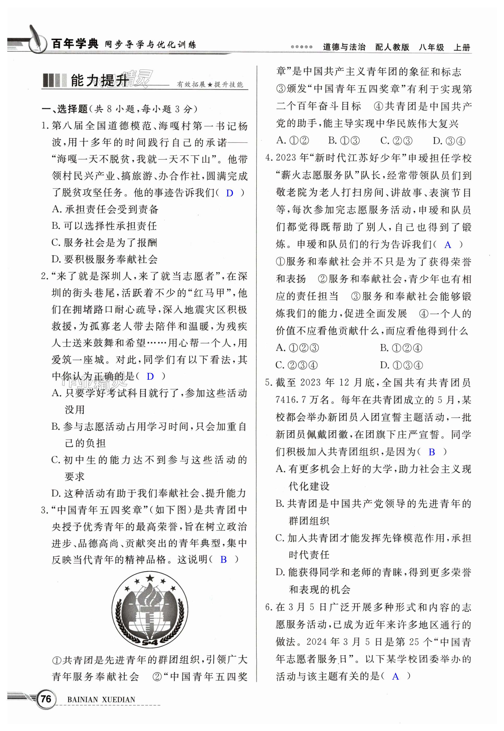 注:目前有些书本章节名称可能整理的还不是很完善,但都是按照顺序排列的,请同学们按照顺序仔细查找。练习册 2024年同步导学与优化训练八年级道德与法治上册人教版 答案主要是用来给同学们做完题方便对答案用的,请勿直接抄袭。
