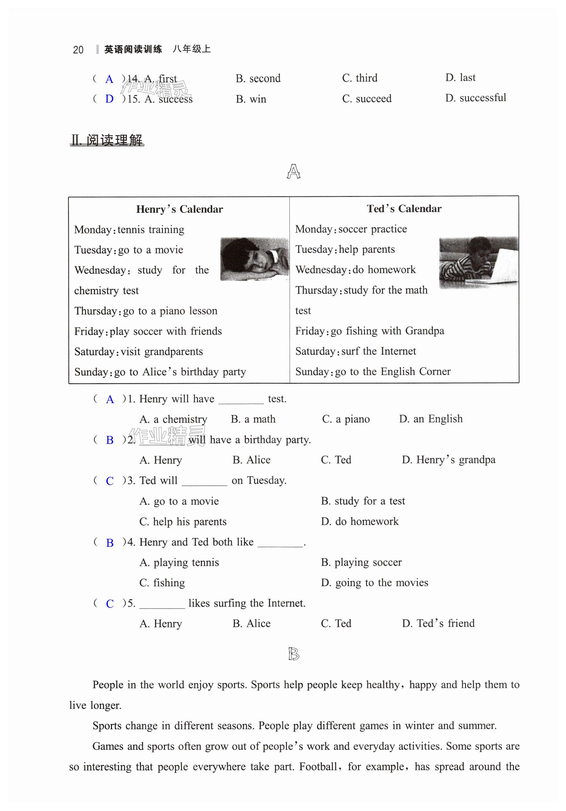 注:目前有些书本章节名称可能整理的还不是很完善,但都是按照顺序排列的,请同学们按照顺序仔细查找。练习册 2024年读无忧英语阅读训练八年级人教版 答案主要是用来给同学们做完题方便对答案用的,请勿直接抄袭。