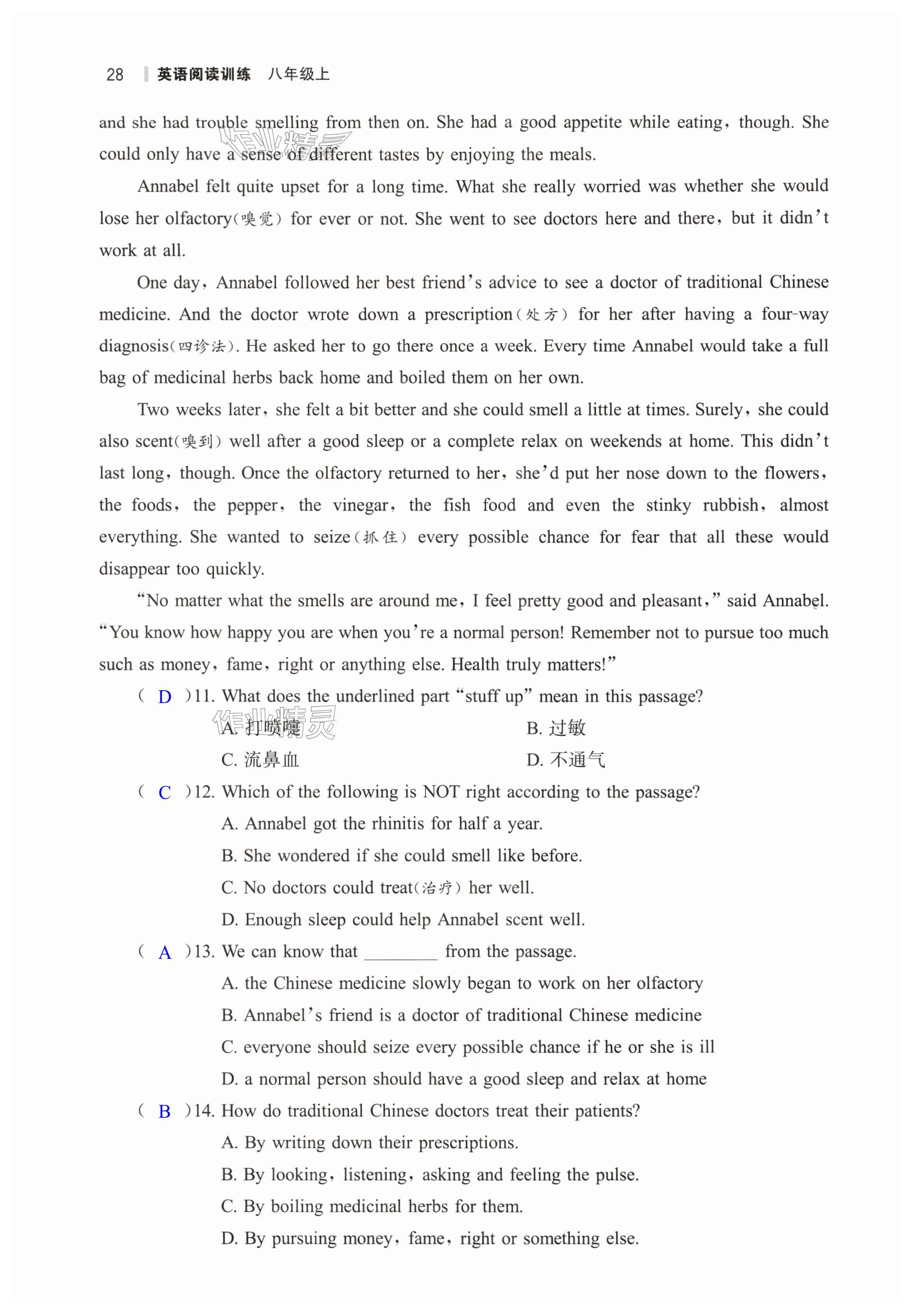 注:目前有些书本章节名称可能整理的还不是很完善,但都是按照顺序排列的,请同学们按照顺序仔细查找。练习册 2024年读无忧英语阅读训练八年级人教版 答案主要是用来给同学们做完题方便对答案用的,请勿直接抄袭。