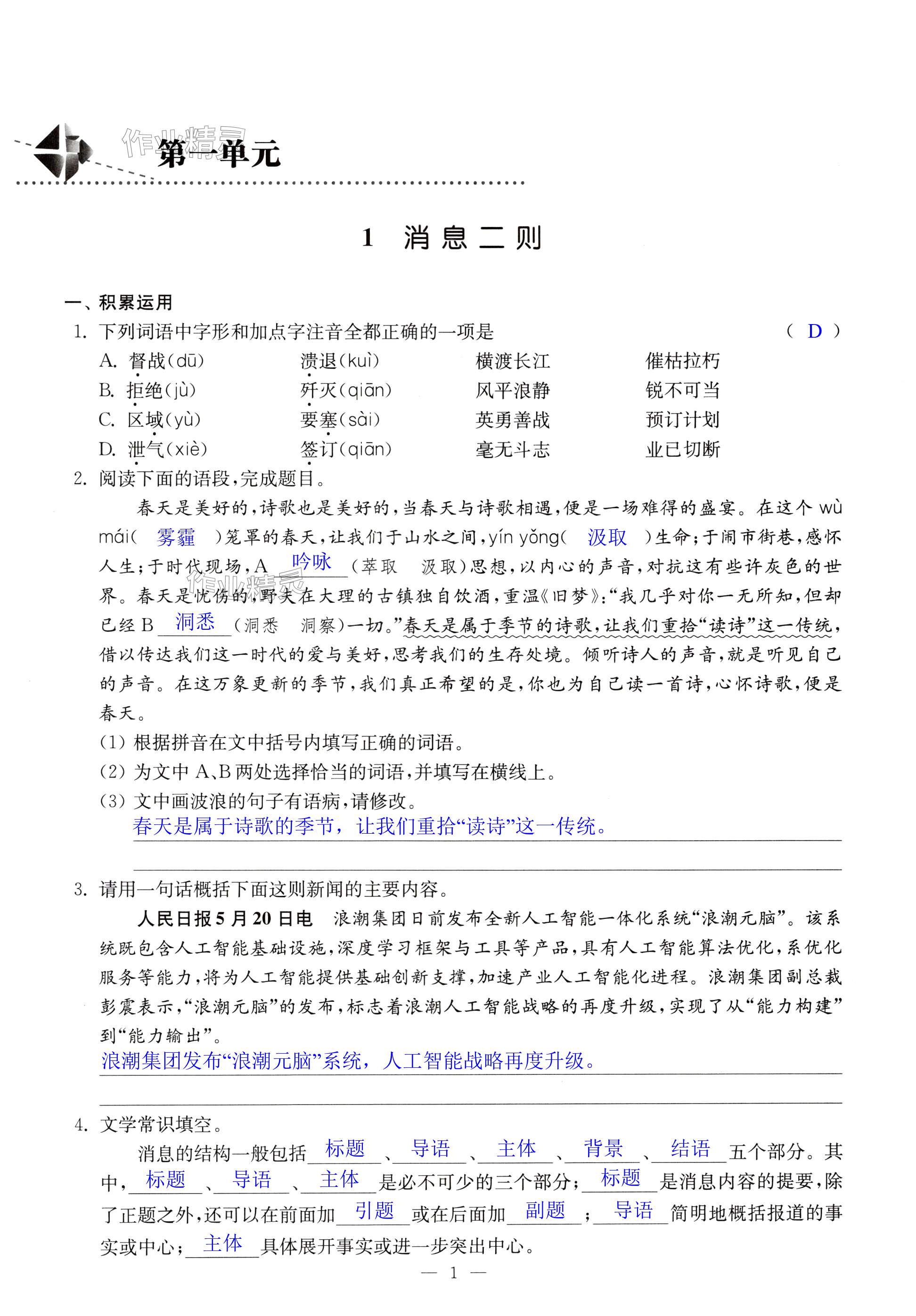 注:目前有些书本章节名称可能整理的还不是很完善,但都是按照顺序排列的,请同学们按照顺序仔细查找。练习册2024年南通小题课时提优作业本八年级语文上册人教版答案主要是用来给同学们做完题方便对答案用的,请勿直接抄袭。