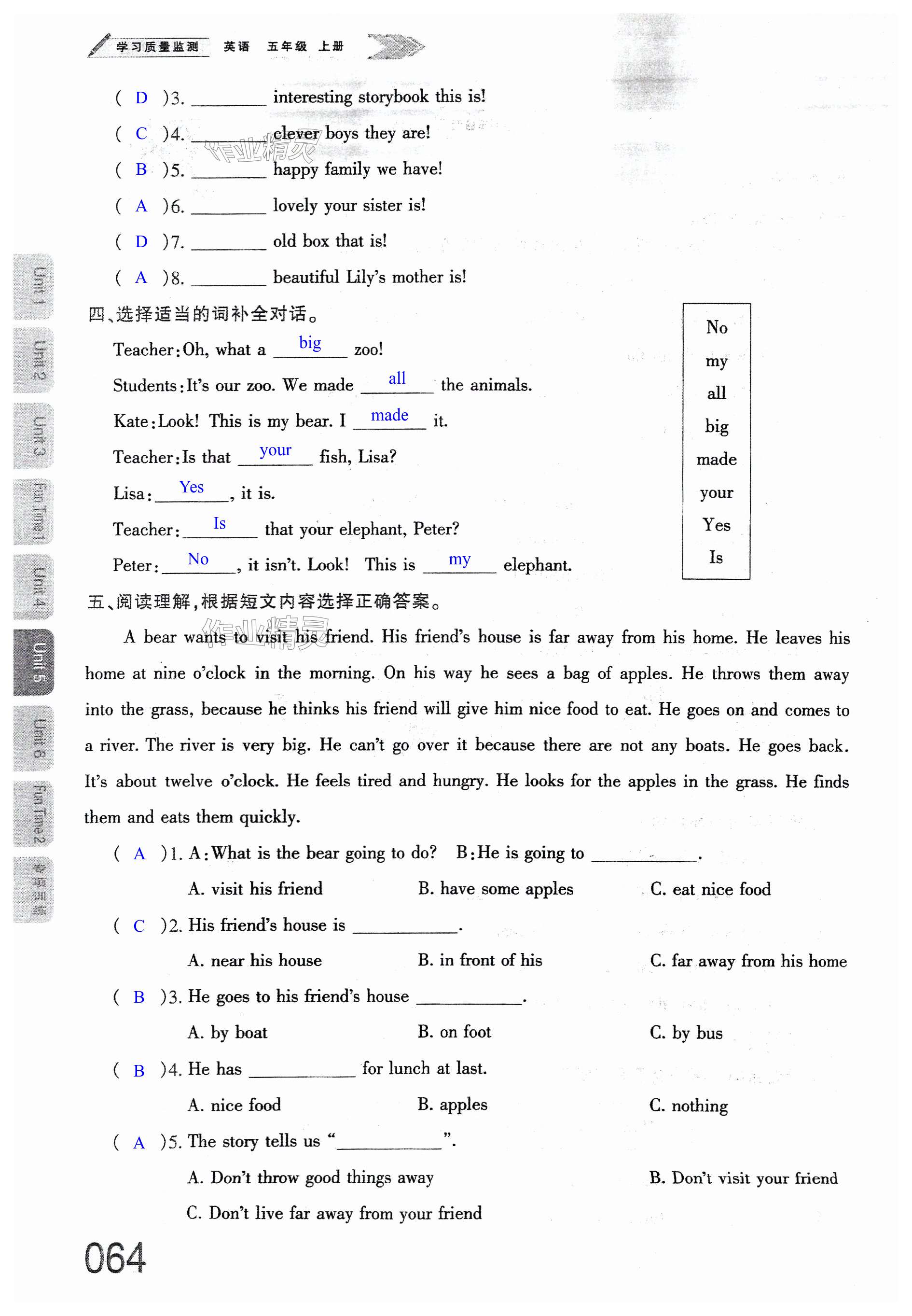 注:目前有些书本章节名称可能整理的还不是很完善,但都是按照顺序排列的,请同学们按照顺序仔细查找。练习册 2024年学习质量监测五年级英语上册人教版 答案主要是用来给同学们做完题方便对答案用的,请勿直接抄袭。
