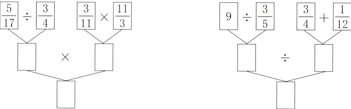 $(\frac{5}{17}÷\frac{3}{4})×(\frac{3}{11}×\frac{11}{3})$;$(9÷\frac{3}{5})÷(\frac{3}{4}+\frac{1}{12})$