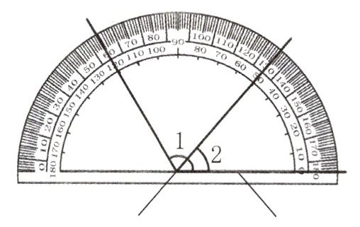 1. 写出量角器上的名称,并读出$∠1和∠2$的度数。