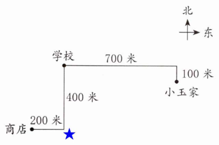 (3)小君家在商店东面200米处,也可以说在学校( )面( )米处,用“★”标出小君家的位置。