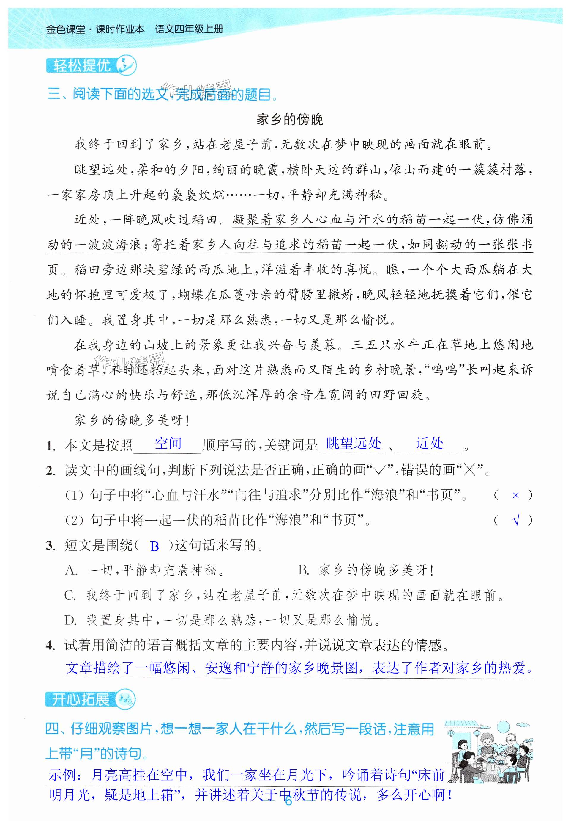 注:目前有些书本章节名称可能整理的还不是很完善,但都是按照顺序排列的,请同学们按照顺序仔细查找。练习册 2024年金色课堂课时作业本四年级语文上册提优版 答案主要是用来给同学们做完题方便对答案用的,请勿直接抄袭。