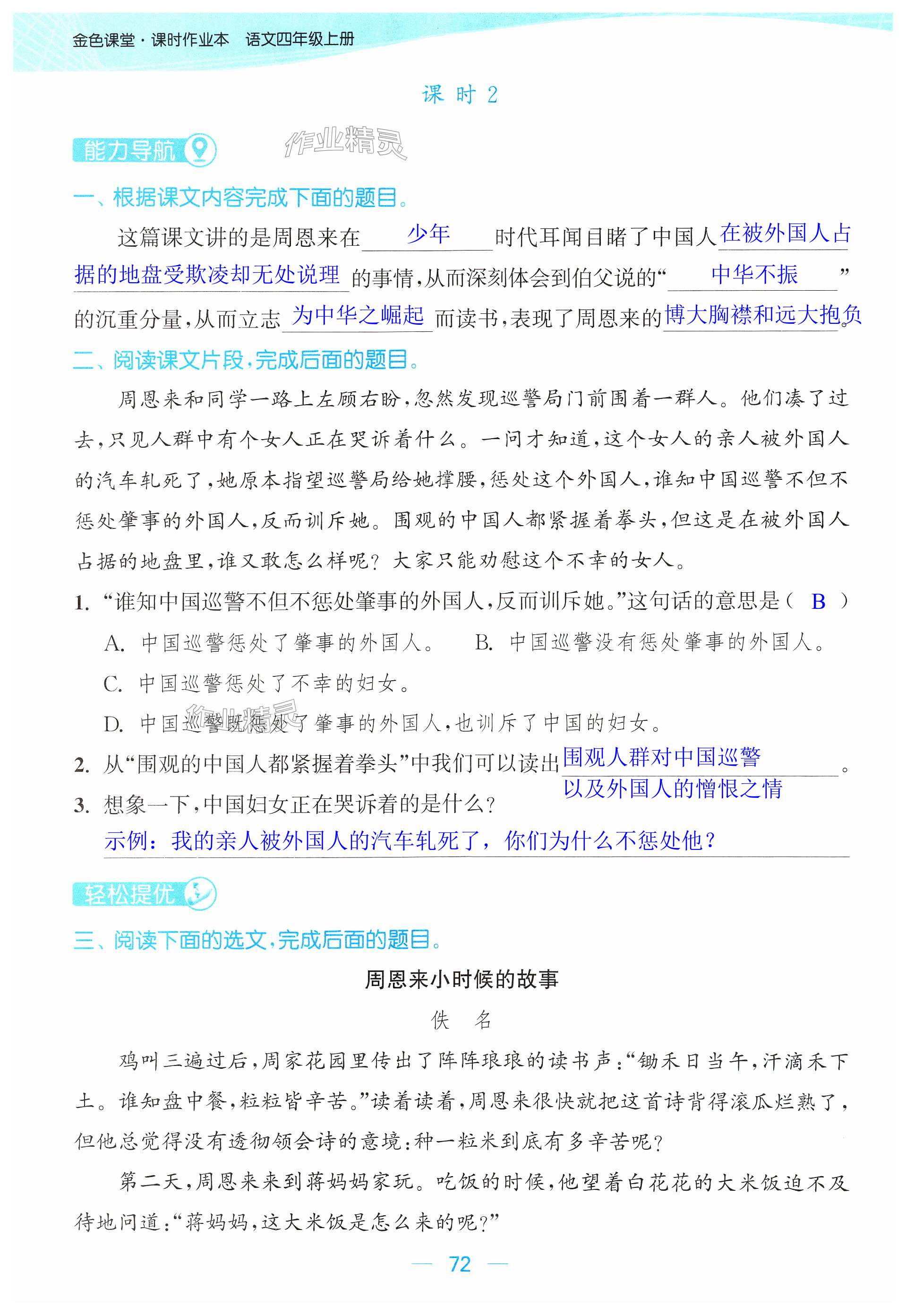 注:目前有些书本章节名称可能整理的还不是很完善,但都是按照顺序排列的,请同学们按照顺序仔细查找。练习册 2024年金色课堂课时作业本四年级语文上册提优版 答案主要是用来给同学们做完题方便对答案用的,请勿直接抄袭。