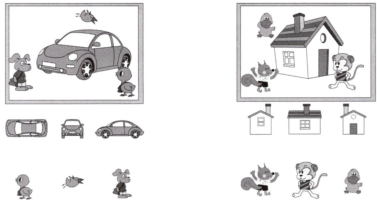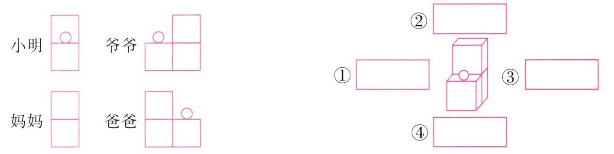2. 下面分别是小明、爸爸、妈妈和爷爷所看到的物体的形状,请你在物体旁边标出四个人所在的位置。