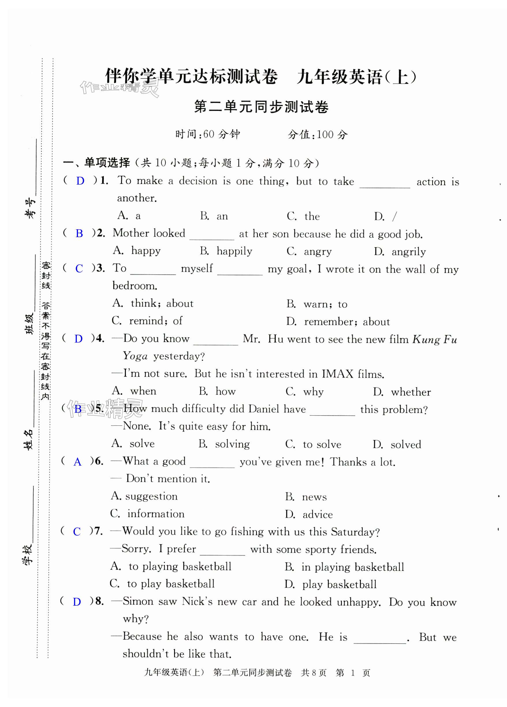 注:目前有些书本章节名称可能整理的还不是很完善,但都是按照顺序排列的,请同学们按照顺序仔细查找。练习册 2024年伴你学单元达标测试卷九年级英语上册译林版 答案主要是用来给同学们做完题方便对答案用的,请勿直接抄袭。