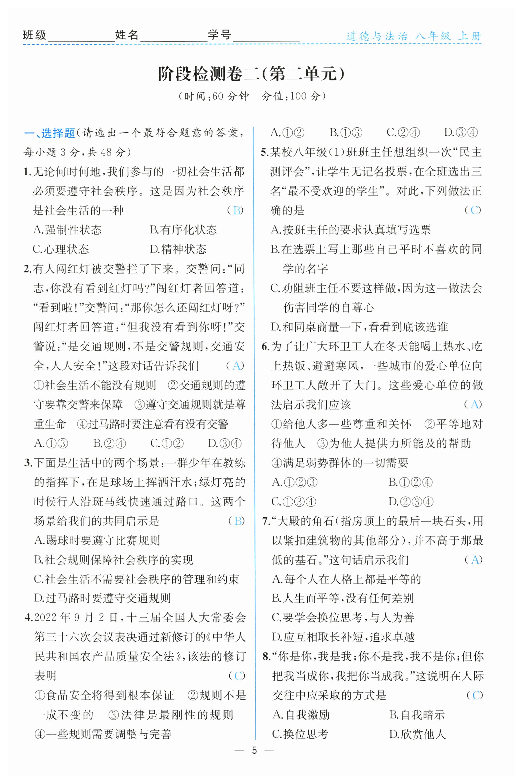 注:目前有些书本章节名称可能整理的还不是很完善,但都是按照顺序排列的,请同学们按照顺序仔细查找。练习册 2024年人教金学典同步解析与测评八年级道德与法治上册人教版云南专版 答案主要是用来给同学们做完题方便对答案用的,请勿直接抄袭。