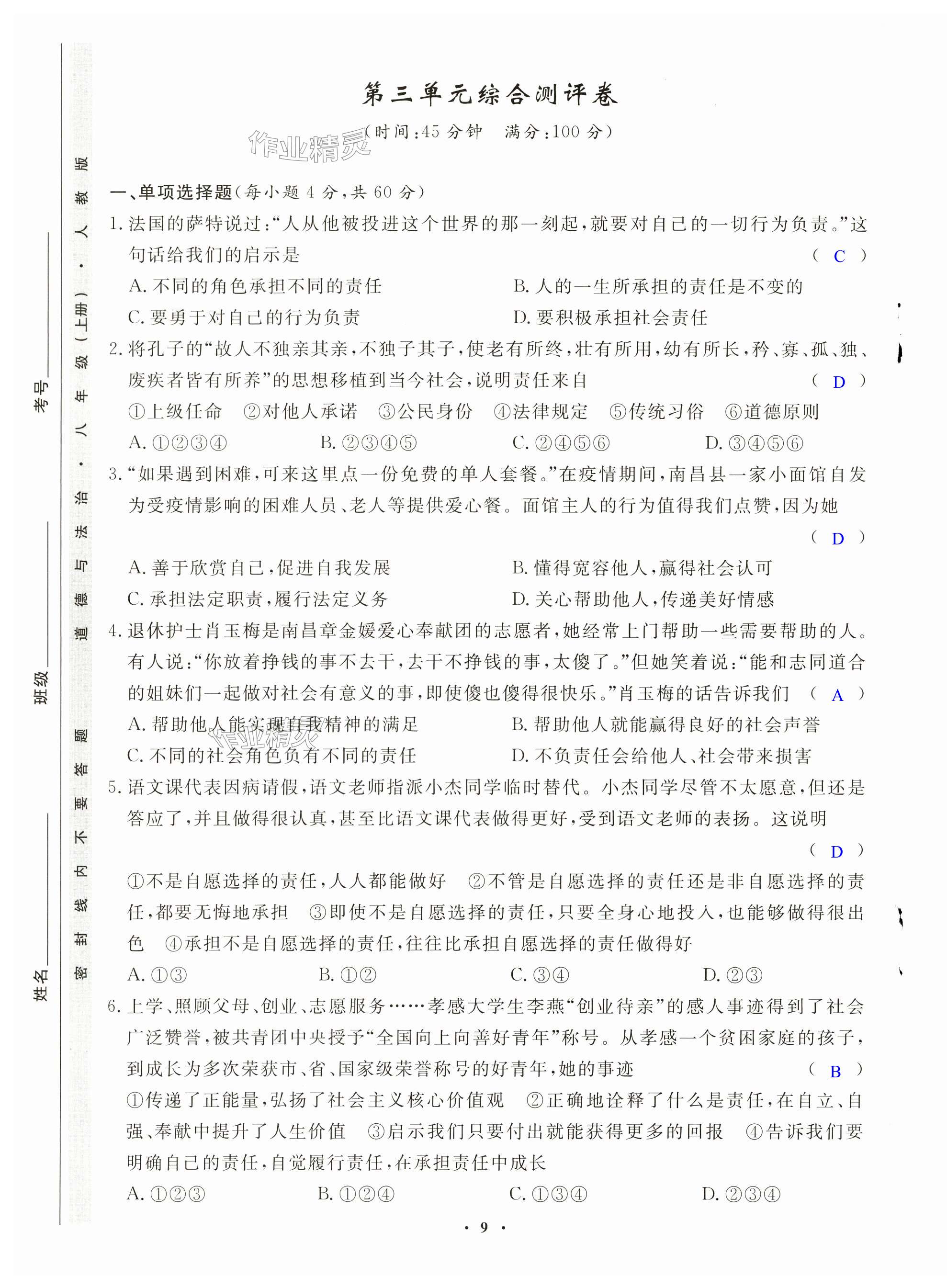 注:目前有些书本章节名称可能整理的还不是很完善,但都是按照顺序排列的,请同学们按照顺序仔细查找。练习册 2024年学生成长册八年级道德与法治上册人教版 答案主要是用来给同学们做完题方便对答案用的,请勿直接抄袭。