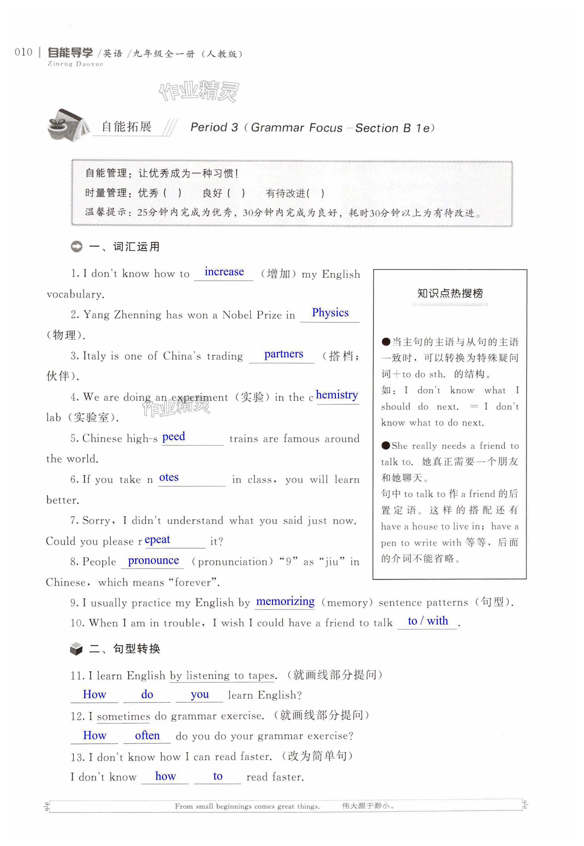 注:目前有些书本章节名称可能整理的还不是很完善,但都是按照顺序排列的,请同学们按照顺序仔细查找。练习册 2024年自能导学九年级英语全一册人教版 答案主要是用来给同学们做完题方便对答案用的,请勿直接抄袭。
