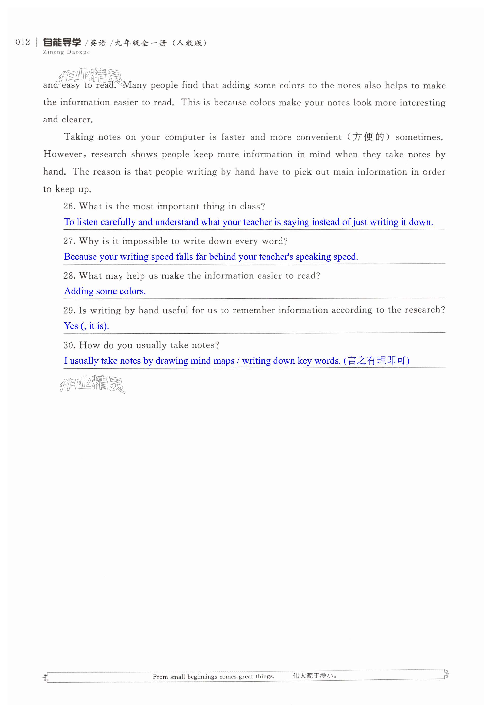 注:目前有些书本章节名称可能整理的还不是很完善,但都是按照顺序排列的,请同学们按照顺序仔细查找。练习册 2024年自能导学九年级英语全一册人教版 答案主要是用来给同学们做完题方便对答案用的,请勿直接抄袭。