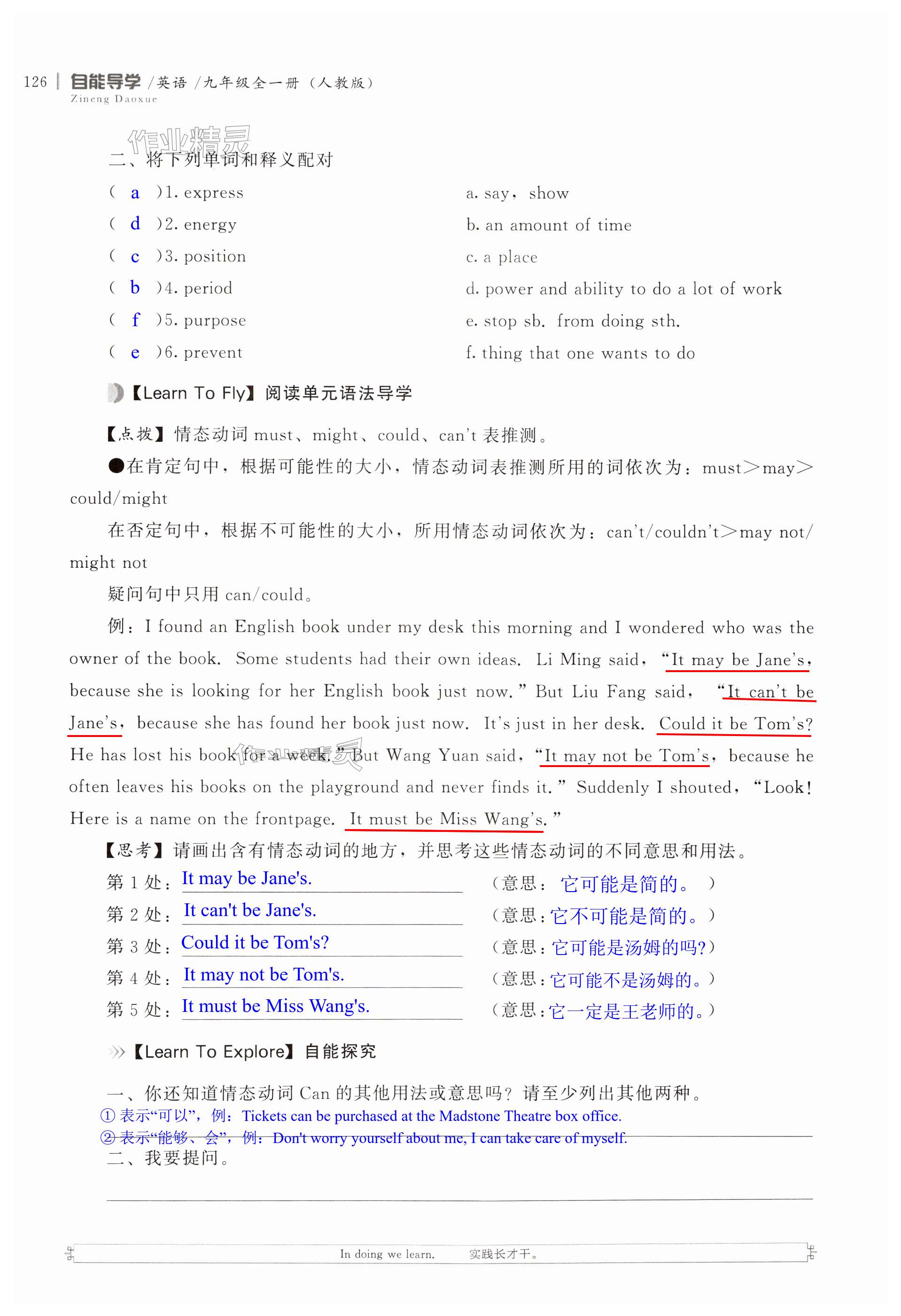 注:目前有些书本章节名称可能整理的还不是很完善,但都是按照顺序排列的,请同学们按照顺序仔细查找。练习册 2024年自能导学九年级英语全一册人教版 答案主要是用来给同学们做完题方便对答案用的,请勿直接抄袭。