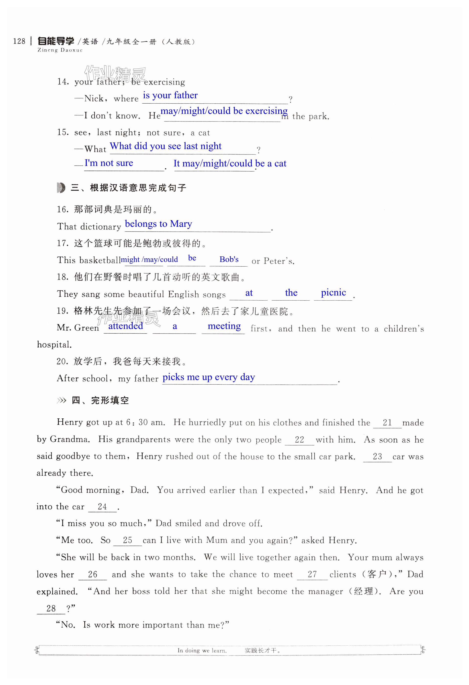 注:目前有些书本章节名称可能整理的还不是很完善,但都是按照顺序排列的,请同学们按照顺序仔细查找。练习册 2024年自能导学九年级英语全一册人教版 答案主要是用来给同学们做完题方便对答案用的,请勿直接抄袭。