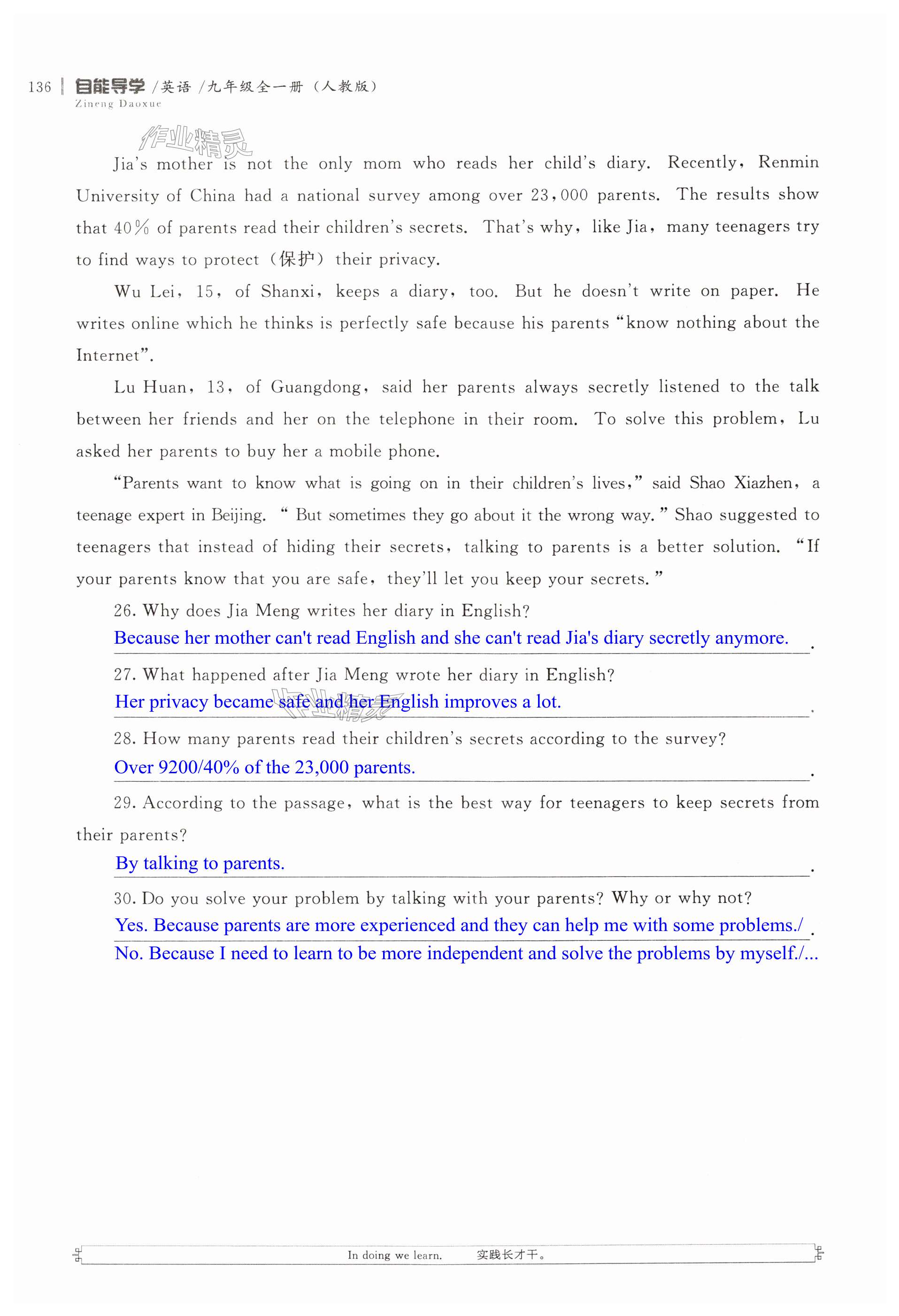 注:目前有些书本章节名称可能整理的还不是很完善,但都是按照顺序排列的,请同学们按照顺序仔细查找。练习册 2024年自能导学九年级英语全一册人教版 答案主要是用来给同学们做完题方便对答案用的,请勿直接抄袭。