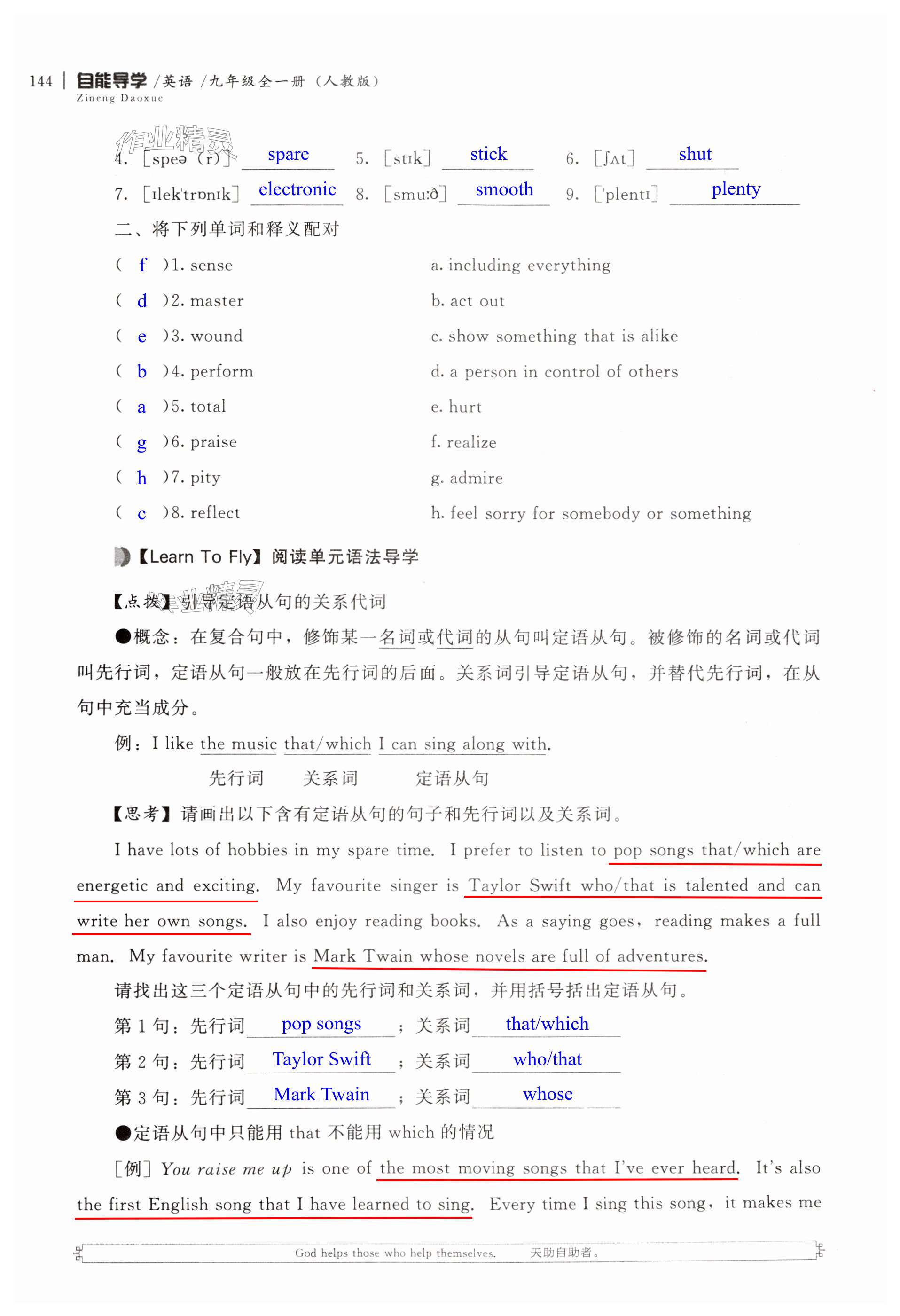 注:目前有些书本章节名称可能整理的还不是很完善,但都是按照顺序排列的,请同学们按照顺序仔细查找。练习册 2024年自能导学九年级英语全一册人教版 答案主要是用来给同学们做完题方便对答案用的,请勿直接抄袭。