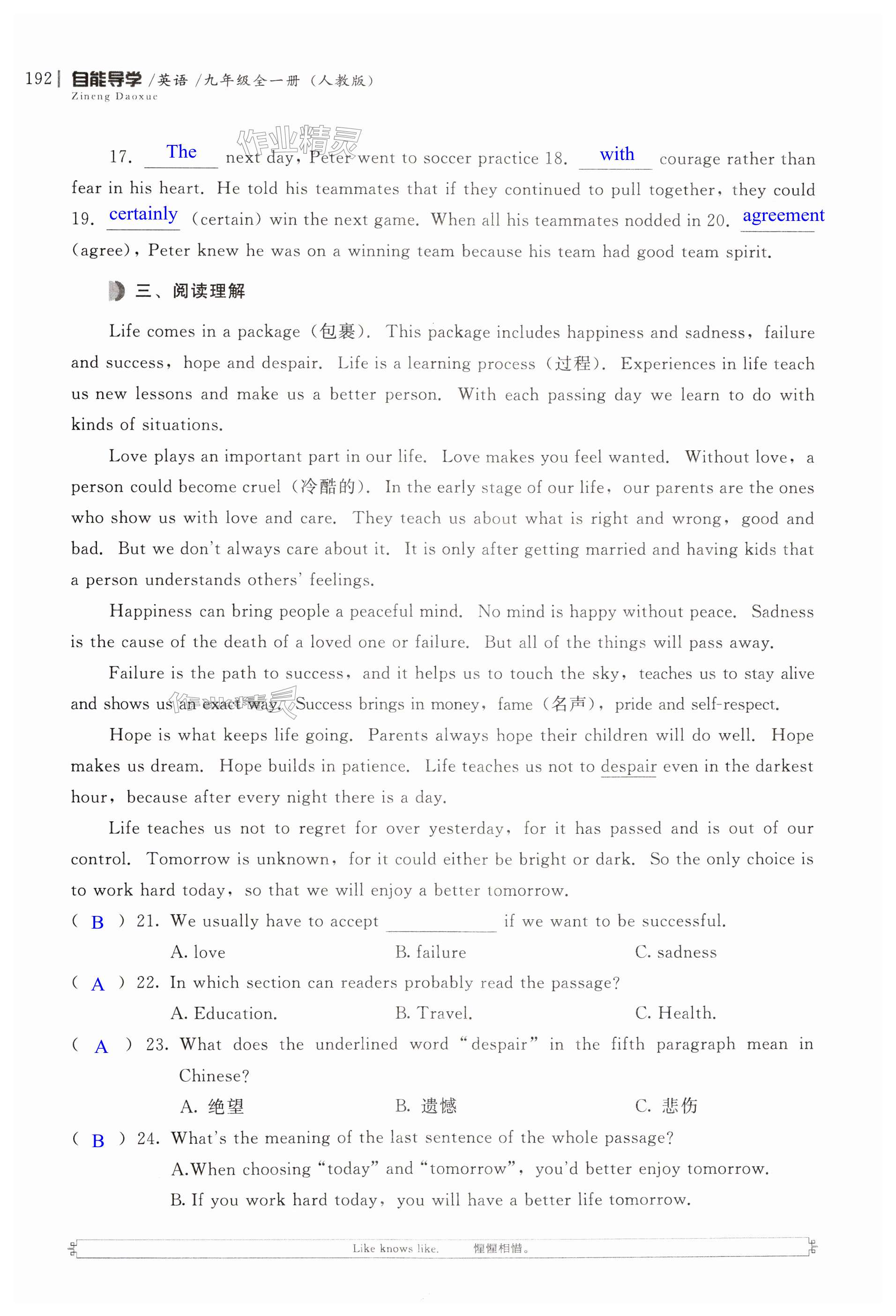 注:目前有些书本章节名称可能整理的还不是很完善,但都是按照顺序排列的,请同学们按照顺序仔细查找。练习册 2024年自能导学九年级英语全一册人教版 答案主要是用来给同学们做完题方便对答案用的,请勿直接抄袭。
