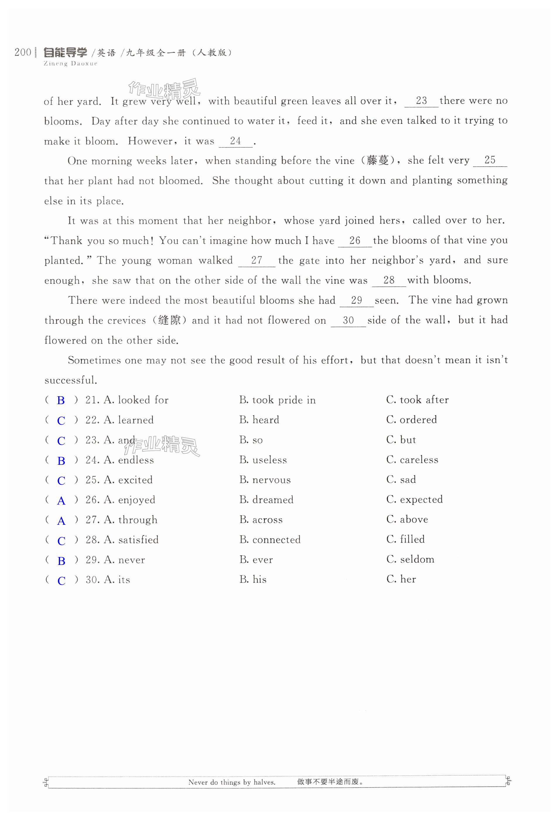 注:目前有些书本章节名称可能整理的还不是很完善,但都是按照顺序排列的,请同学们按照顺序仔细查找。练习册 2024年自能导学九年级英语全一册人教版 答案主要是用来给同学们做完题方便对答案用的,请勿直接抄袭。