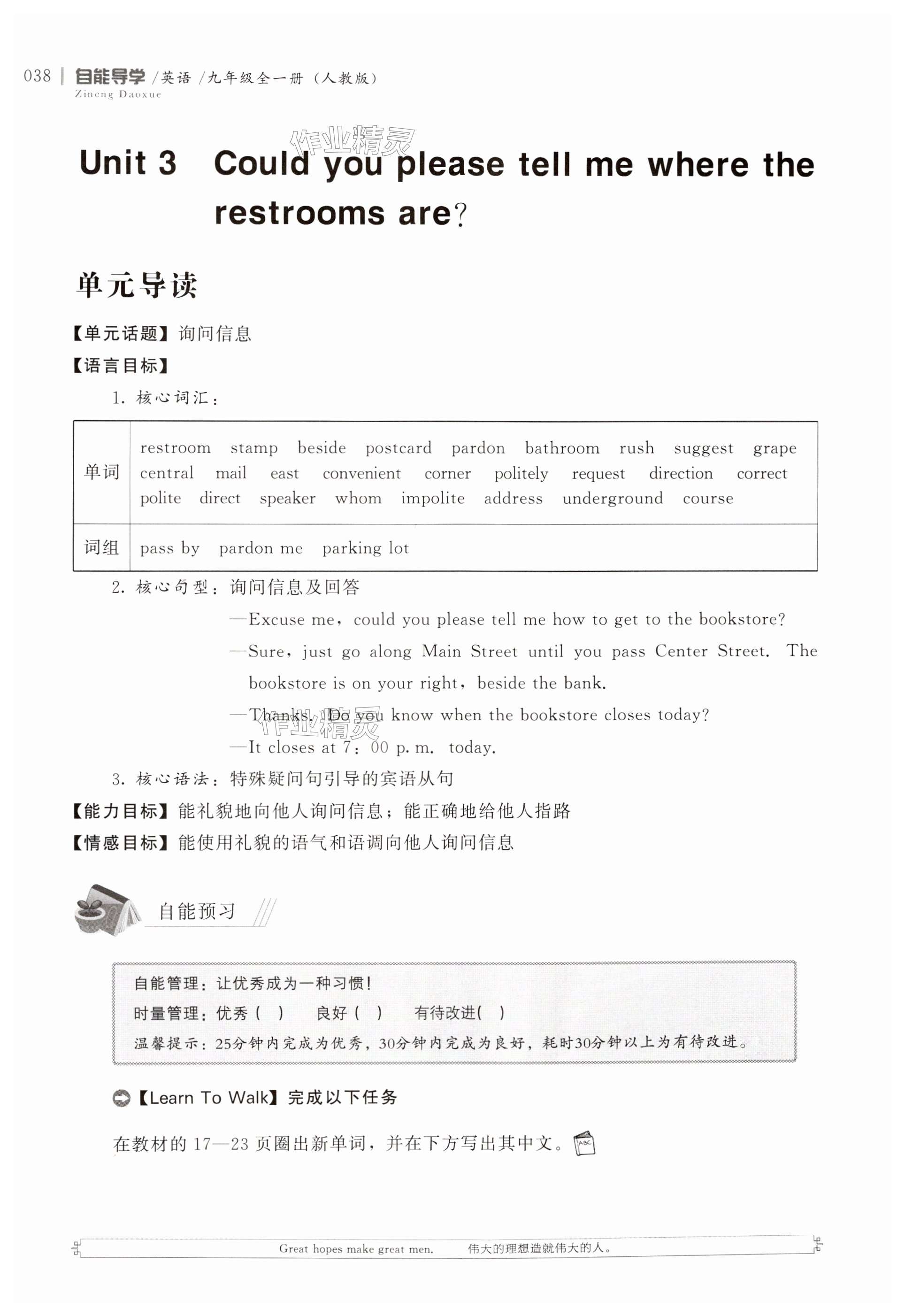 注:目前有些书本章节名称可能整理的还不是很完善,但都是按照顺序排列的,请同学们按照顺序仔细查找。练习册 2024年自能导学九年级英语全一册人教版 答案主要是用来给同学们做完题方便对答案用的,请勿直接抄袭。