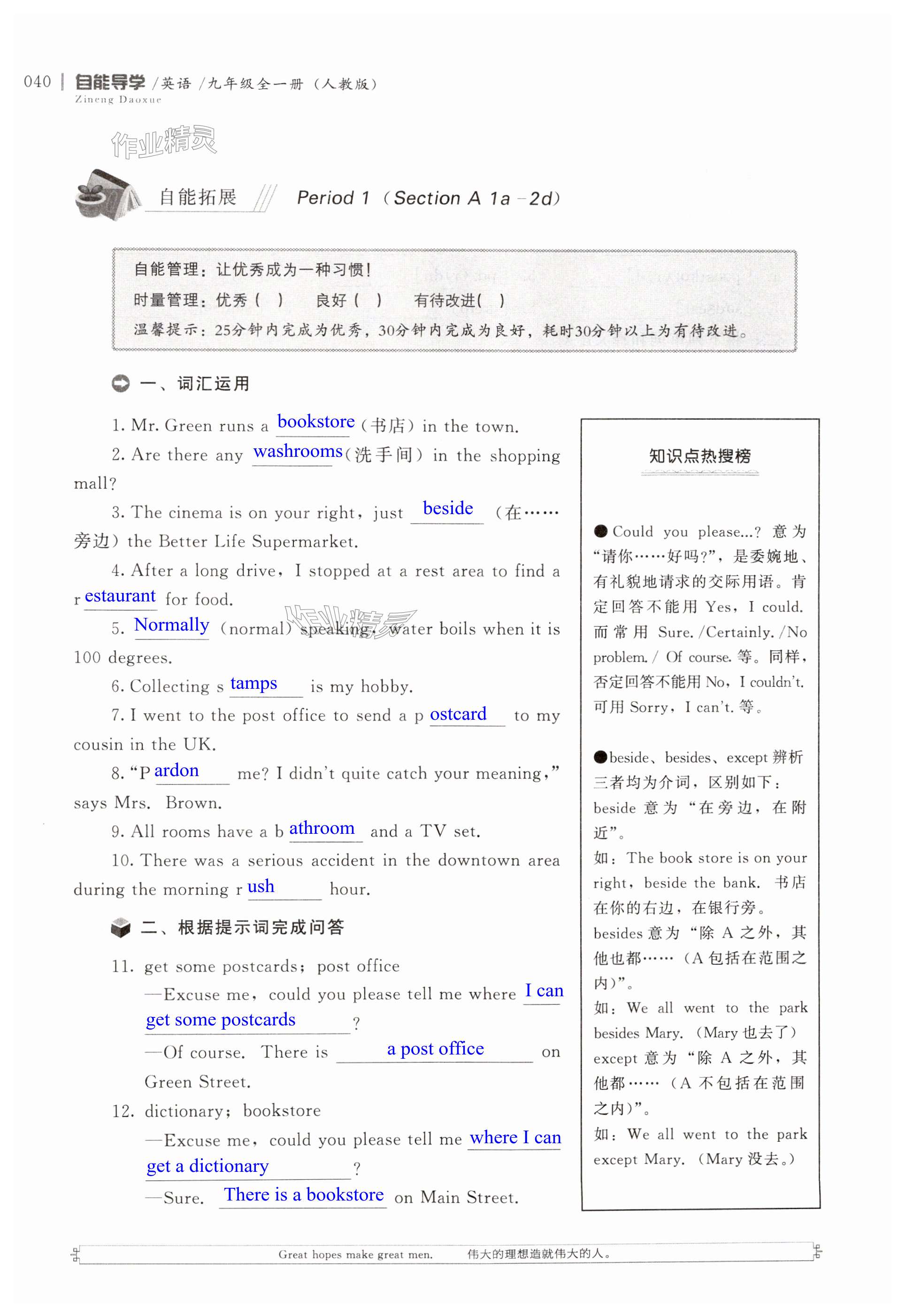 注:目前有些书本章节名称可能整理的还不是很完善,但都是按照顺序排列的,请同学们按照顺序仔细查找。练习册 2024年自能导学九年级英语全一册人教版 答案主要是用来给同学们做完题方便对答案用的,请勿直接抄袭。