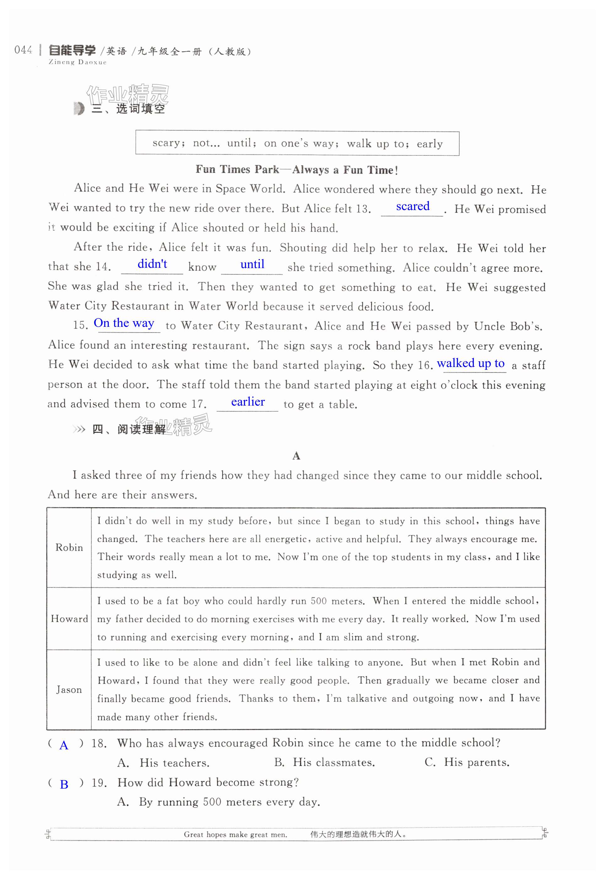 注:目前有些书本章节名称可能整理的还不是很完善,但都是按照顺序排列的,请同学们按照顺序仔细查找。练习册 2024年自能导学九年级英语全一册人教版 答案主要是用来给同学们做完题方便对答案用的,请勿直接抄袭。