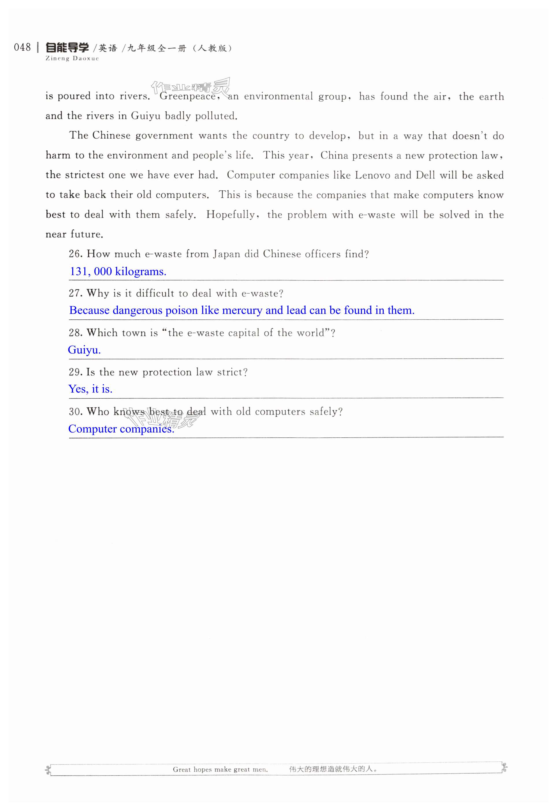 注:目前有些书本章节名称可能整理的还不是很完善,但都是按照顺序排列的,请同学们按照顺序仔细查找。练习册 2024年自能导学九年级英语全一册人教版 答案主要是用来给同学们做完题方便对答案用的,请勿直接抄袭。