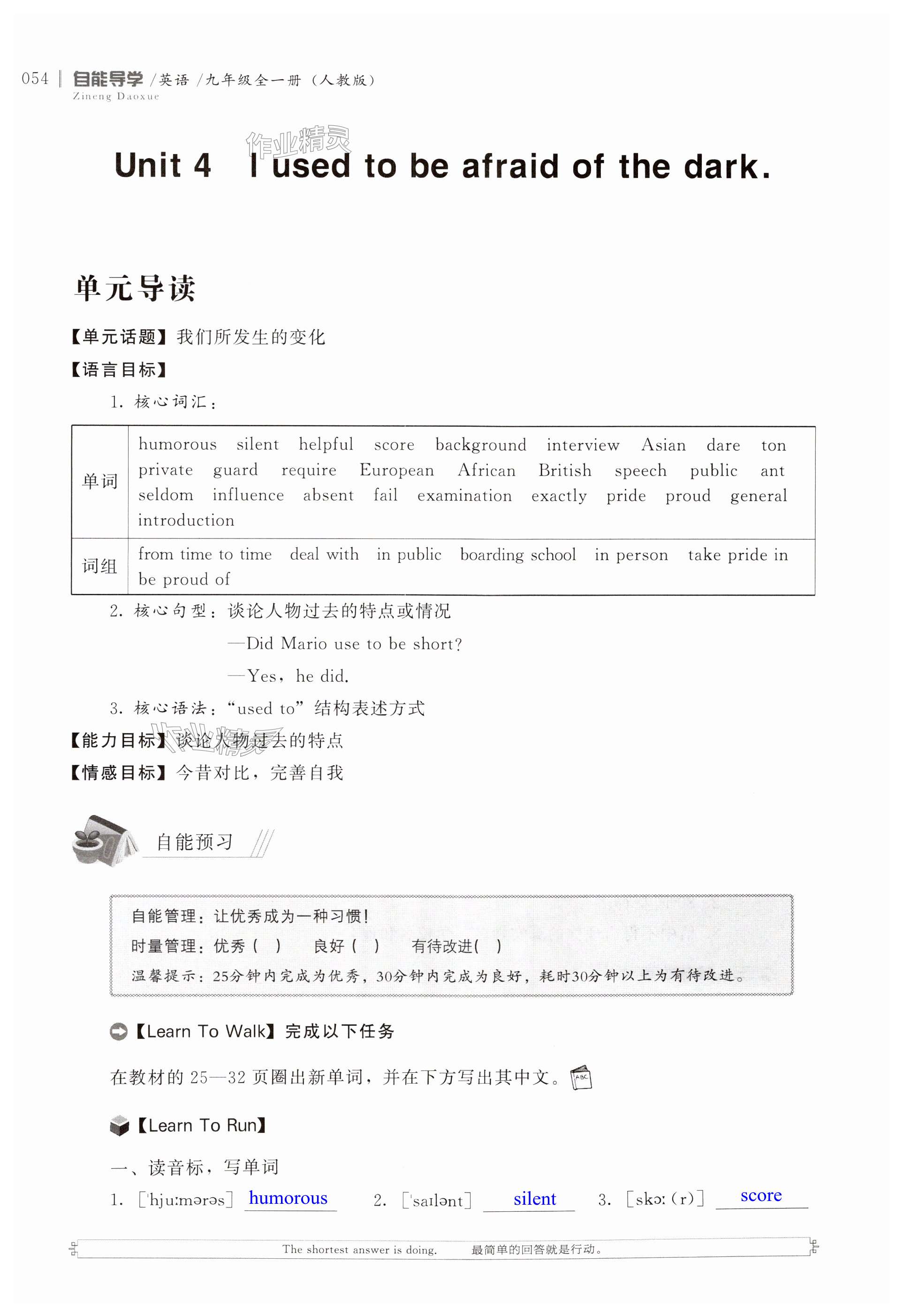 注:目前有些书本章节名称可能整理的还不是很完善,但都是按照顺序排列的,请同学们按照顺序仔细查找。练习册 2024年自能导学九年级英语全一册人教版 答案主要是用来给同学们做完题方便对答案用的,请勿直接抄袭。