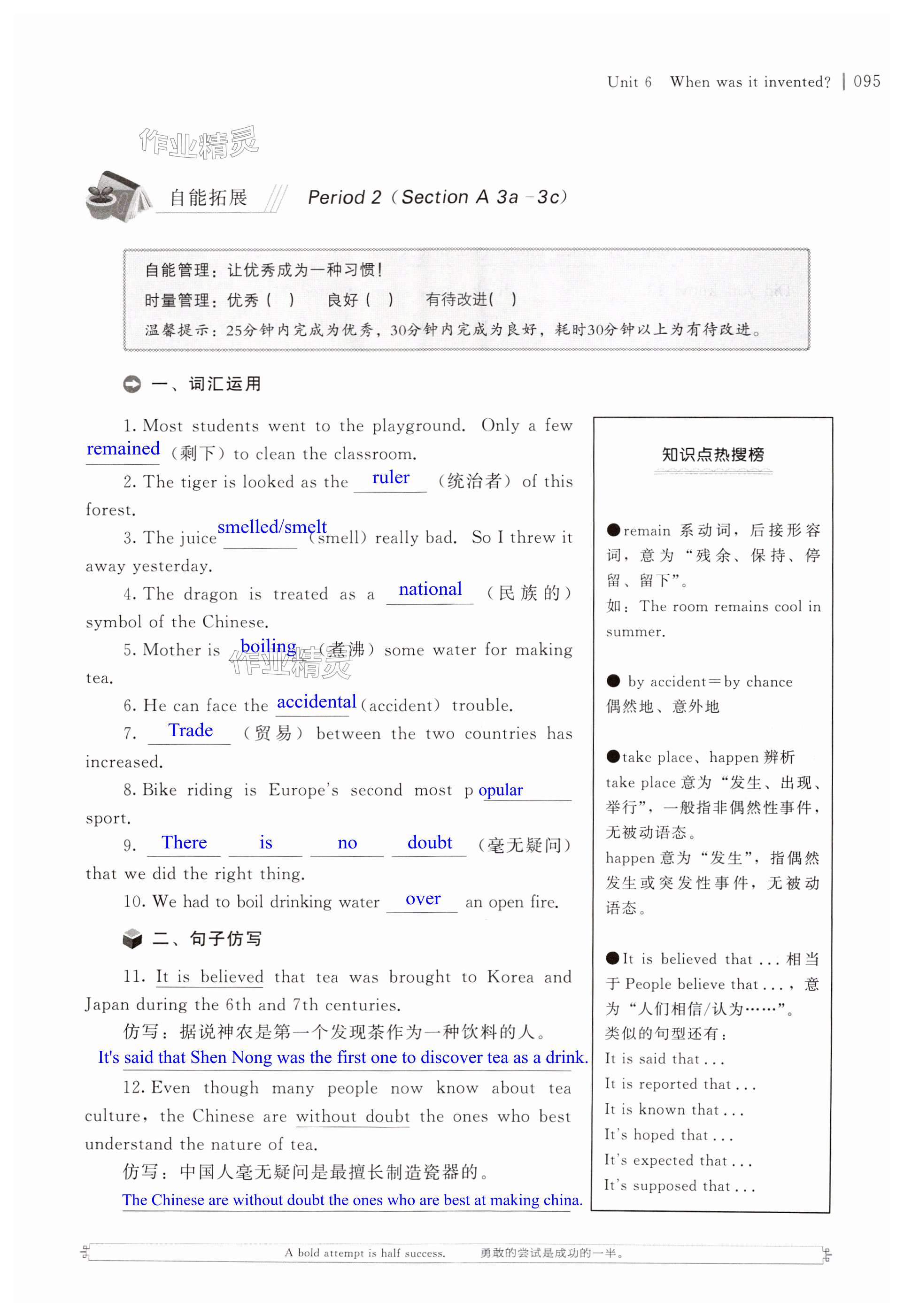 注:目前有些书本章节名称可能整理的还不是很完善,但都是按照顺序排列的,请同学们按照顺序仔细查找。练习册 2024年自能导学九年级英语全一册人教版 答案主要是用来给同学们做完题方便对答案用的,请勿直接抄袭。