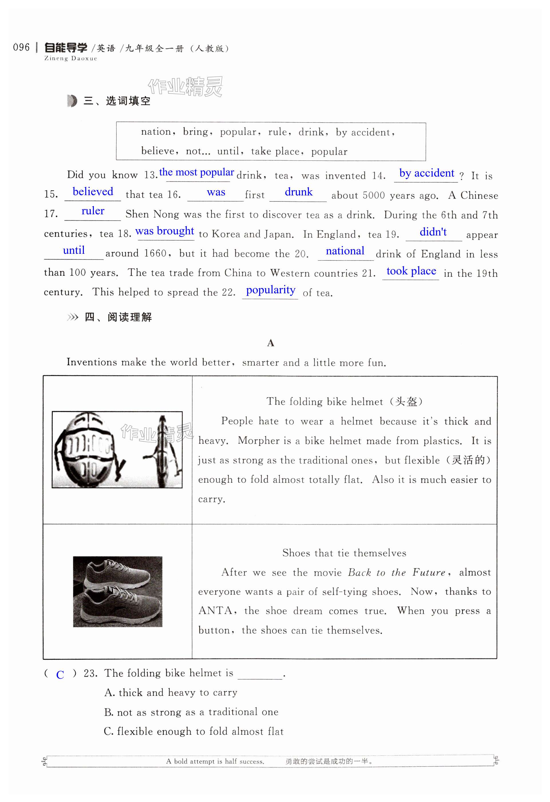 注:目前有些书本章节名称可能整理的还不是很完善,但都是按照顺序排列的,请同学们按照顺序仔细查找。练习册 2024年自能导学九年级英语全一册人教版 答案主要是用来给同学们做完题方便对答案用的,请勿直接抄袭。