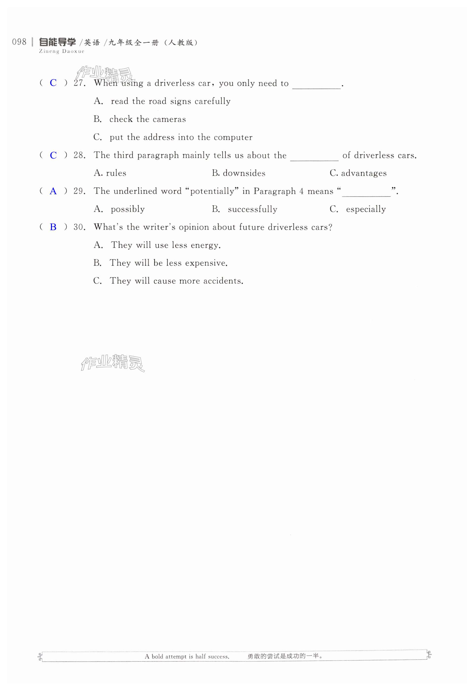 注:目前有些书本章节名称可能整理的还不是很完善,但都是按照顺序排列的,请同学们按照顺序仔细查找。练习册 2024年自能导学九年级英语全一册人教版 答案主要是用来给同学们做完题方便对答案用的,请勿直接抄袭。